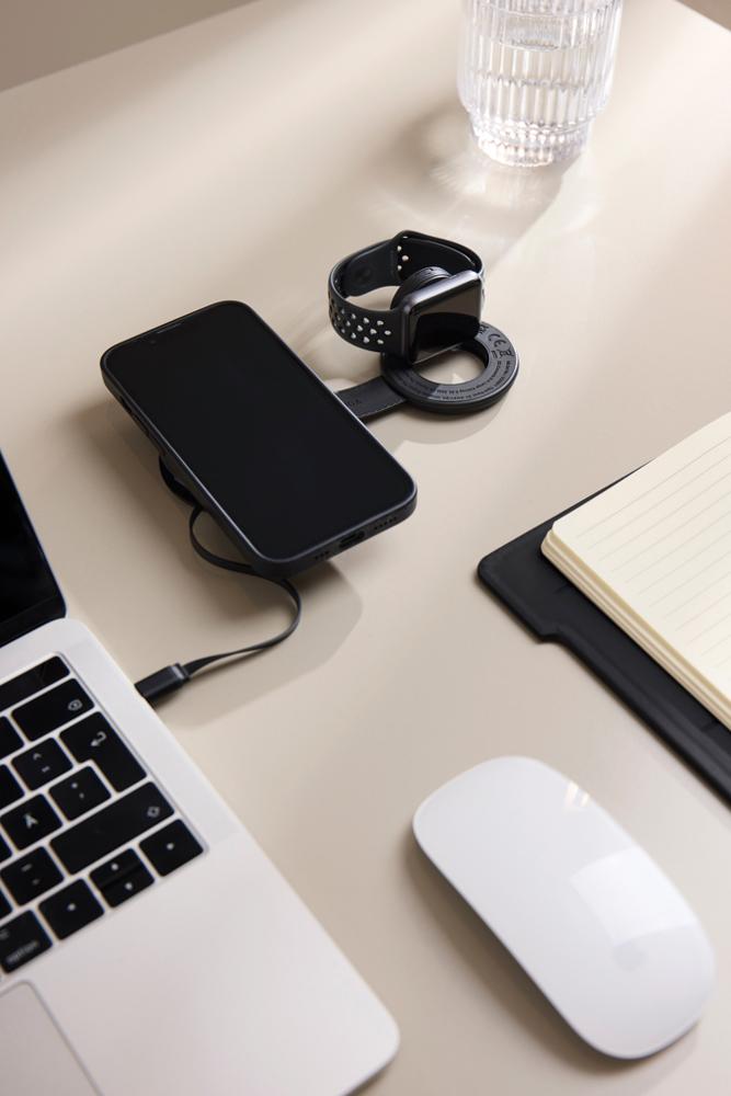 - Dual charging convenience: Powers Qi-enabled smartphones (up to 15W) and watches (2.5W) simultaneously with precise magnetic alignment, eliminating cable chaos and supporting busy professionals on the move.