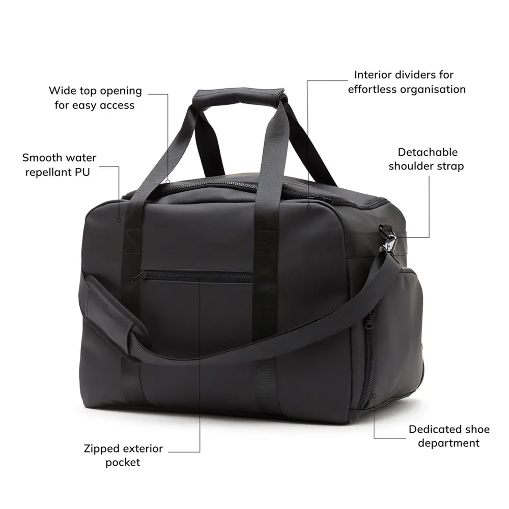 The secure zipper main compartment, multiple interior pockets for easy organization, and dedicated shoe compartment on the short side keep contents clean and accessible. Sturdy handles allow full loading, while the adjustable shoulder strap ensures comfortable portability.