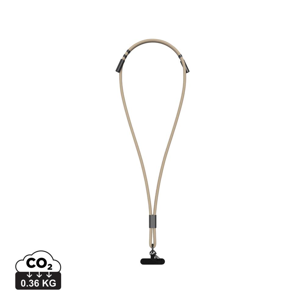 Elevate your brand visibility with the VINGA Baltimore RCS Phone Cord with Charging Cable, the ultimate hands-free accessory for marketing giveaways and event promotions. This innovative lanyard-style cord, crafted from RCS-certified recycled TPE with a sleek matte PU coating, wraps comfortably around the neck for secure, tangle-free phone access on the go—perfect for busy professionals and recipients alike.