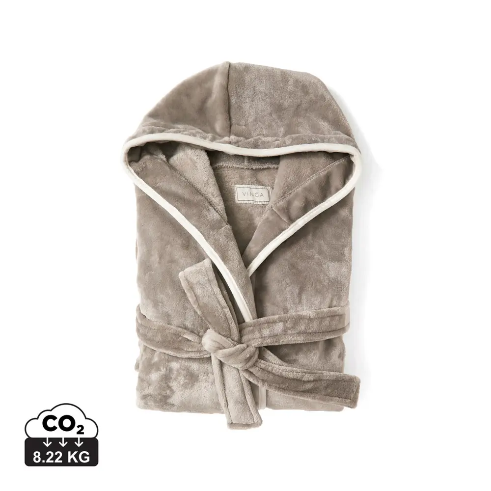 Elevate your brand with the VINGA Louis luxury plush robe, a soft and cosy essential perfect for personalized promotional gifts. Crafted from 68% recycled rPET material (350 g/m²), it features a large hood, decorative piping, two front pockets, and an adjustable waist belt for ultimate comfort in size L/XL. OEKO-TEX Standard 100 certified for safety, and GRS verified for a sustainable supply chain, this robe reduces environmental impact through vacuum-packing that minimizes shipping volume and carbon footprint.