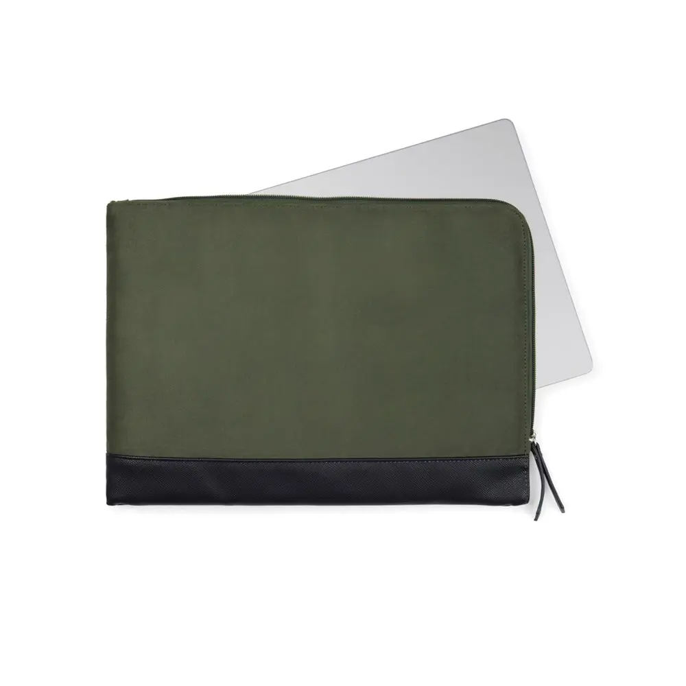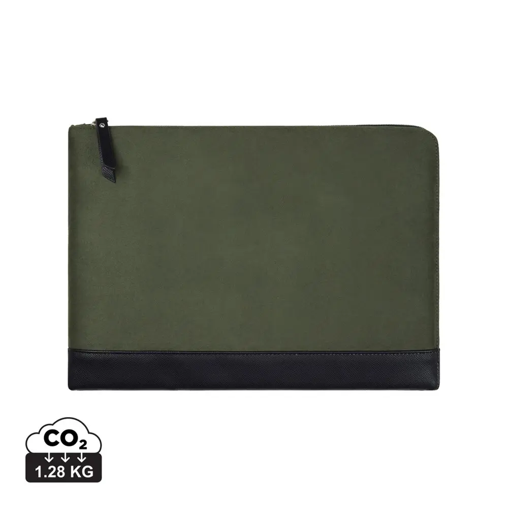 This sleek sleeve offers reliable protection with an extra-long zipper for effortless access. Inside, discover a handy pocket for essentials like cables or business cards. Designed to fit 14-inch laptops and tablets precisely, ensuring a snug and secure fit. Crafted from recycled faux suede with PU details and a recycled polyester lining, it combines durability with a premium feel. Finished with elegant silver hardware for a professional touch.