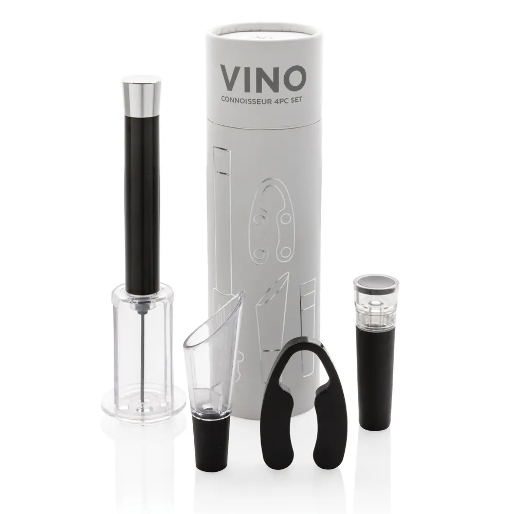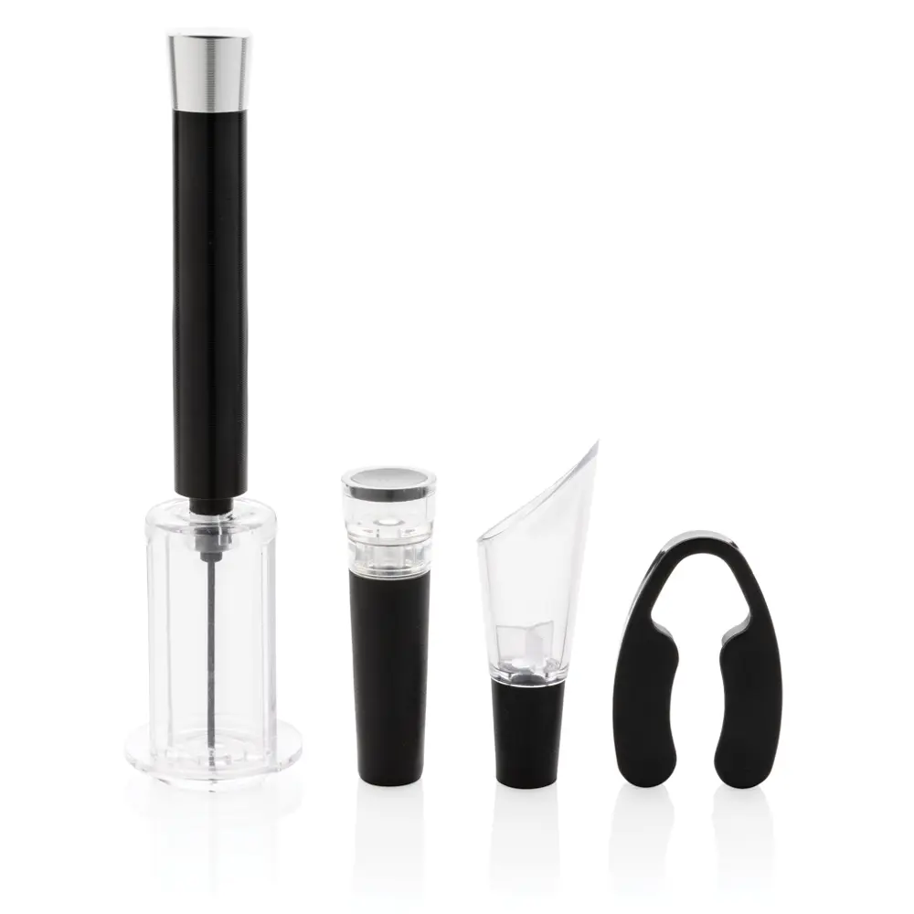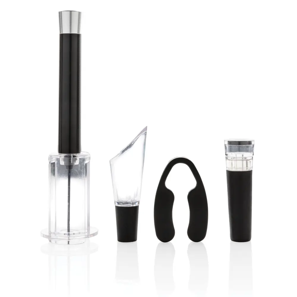 Elevate your corporate gifting with the Vino Connoisseur 4pc Set, a premium collection designed for wine enthusiasts. This versatile set includes an air pump wine opener for effortless bottle access, a foil cutter for precise preparation, a vacuum pump stopper to preserve freshness longer, and a pourer with aerator for smooth, enhanced tasting. Crafted from durable ABS and stainless steel, it meets stringent safety standards including cadmium directive compliance and food-safe regulations.