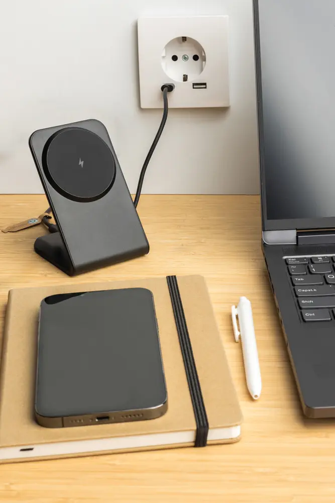 Elevate your brand with the VoltPerch 15W magnetic wireless charger, a customizable promotional gift perfect for marketing teams and event organizers. This eco-friendly stand delivers fast 15W charging with a strong magnetic hold from 15 premium magnets, ensuring precise alignment in portrait or landscape mode for compatible devices. Stable silicone base grips any surface, and a built-in LED indicator shows charging status at a glance.