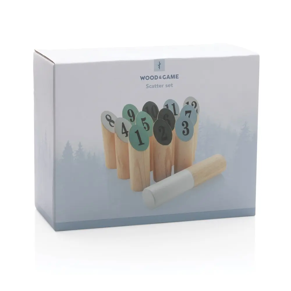 Elevate your brand's visibility with our customizable Wooden Scatter Set, a thrilling tactical game perfect for corporate events, trade shows, and promotional giveaways. Challenge players to underhand toss the wooden cylinder at 12 numbered pins to score exactly 50 points without going over—simple to learn yet endlessly addictive, fostering team spirit and memorable interactions.