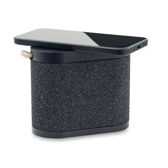 Elevate your brand visibility with the WUSIC 15W Wireless Charger Speaker, a multifunctional promotional essential perfect for marketing teams and event organizers. Crafted from durable ABS with an eco-friendly RPET polyester fabric finish, bamboo charging surface, and jute handle for easy portability, this compact 5.3-inch speaker combines high-quality audio with convenient wireless charging capabilities.