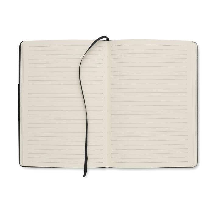 - A5 notebook: Hard RPET cover, casebound construction, 160 lined recycled paper pages (80 sheets), elastic closure strap, ribbon page marker, and pen holder for practical daily use. See Notebook A5.