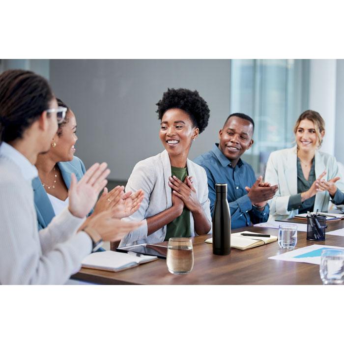 Complementing the notebook is a matching twist ball pen, ideal for quick notes, and a double-wall stainless steel vacuum-insulated bottle with 500 ml capacity to keep drinks hot or cold for hours. All components arrive presented in an elegant gift box, FSC®-certified (FSC MIX CREDIT, P7.1, FSC-C213206) for sustainable appeal.