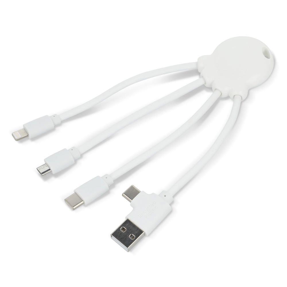 Le câble de charge Eco Octopus en plastique lié à l'océan est l'accessoire promotionnel idéal pour vos campagnes marketing et événements. Fabriqué à partir de matériaux recyclés issus des océans, il incarne un engagement écologique fort, tout en offrant une polyvalence exceptionnelle avec deux entrées (USB-A et USB-C) et trois connecteurs adaptables pour charger tous vos appareils mobiles.