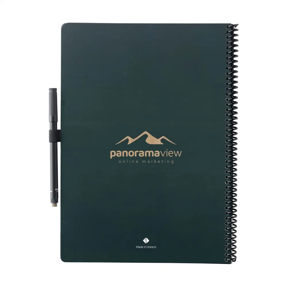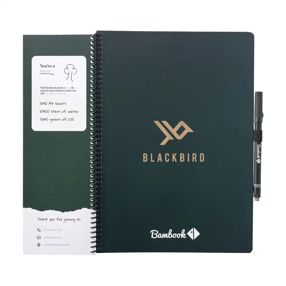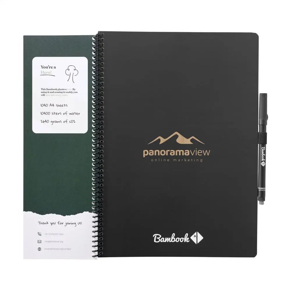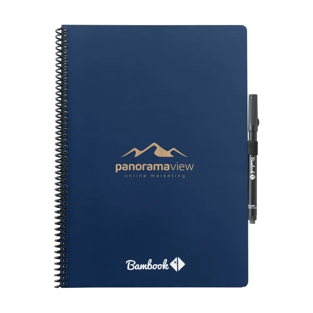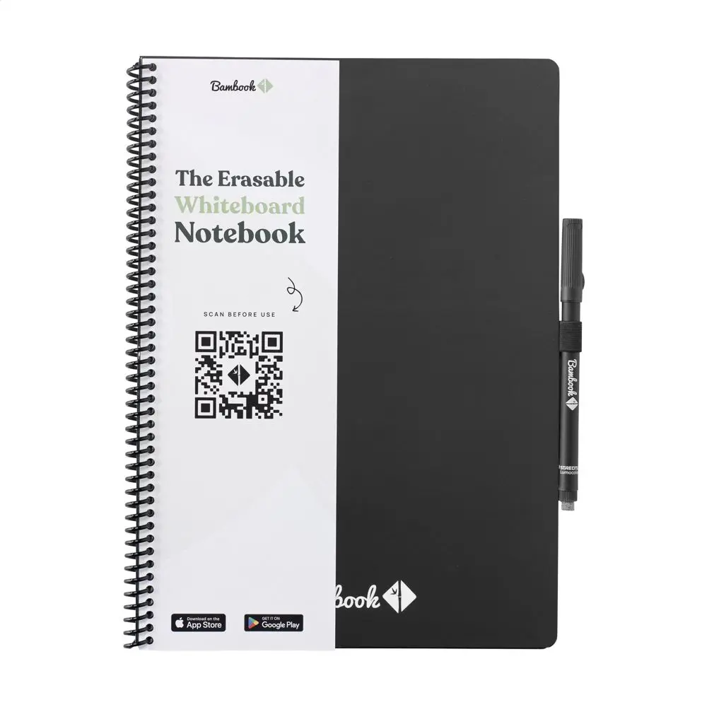 Découvrez le Bambook Classic Original Notebook A4, un cahier effaçable idéal pour vos campagnes marketing et événements d'entreprise. Fabriqué à la main en Hollande avec une couverture en carton certifié FSC et un motif subtil de bambou, il offre 20 feuilles lignées réutilisables (40 pages). Écrivez avec le marqueur inclus, scannez vos notes via l'application Bambook pour les archiver numériquement, puis effacez-les facilement avec un chiffon humide pour une réutilisation infinie.