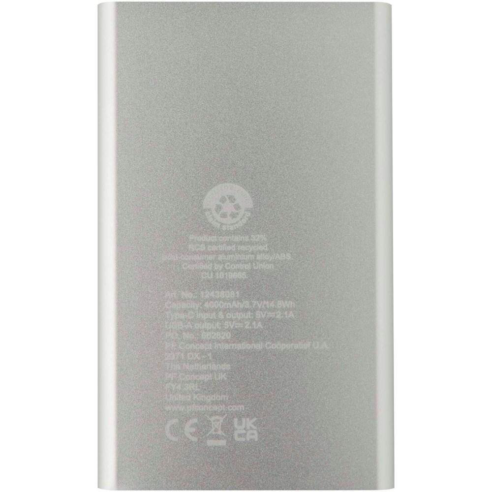Chargez facilement votre batterie de secours ou vos appareils grâce aux ports d'entrée/sortie type-C. Utilisez simultanément le port USB-A pour recharger deux appareils en même temps. Idéale pour les événements et campagnes marketing, cette powerbank en aluminium recyclé à 25 % (certifié RCS) offre une batterie lithium-polymère de 4000 mAh avec une puissance maximale de 10 W.