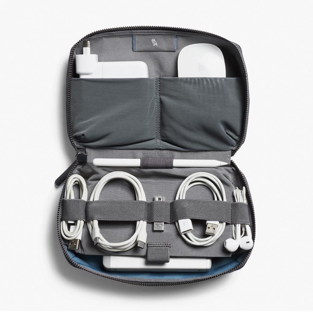 Zippable à plat pour un accès instantané, elle intègre une poche magnétique parfaite pour une batterie externe, des poches en filet extensible pour petits objets et pièces, ainsi qu'un mur flottant avec organiseur élastique pour câbles.
