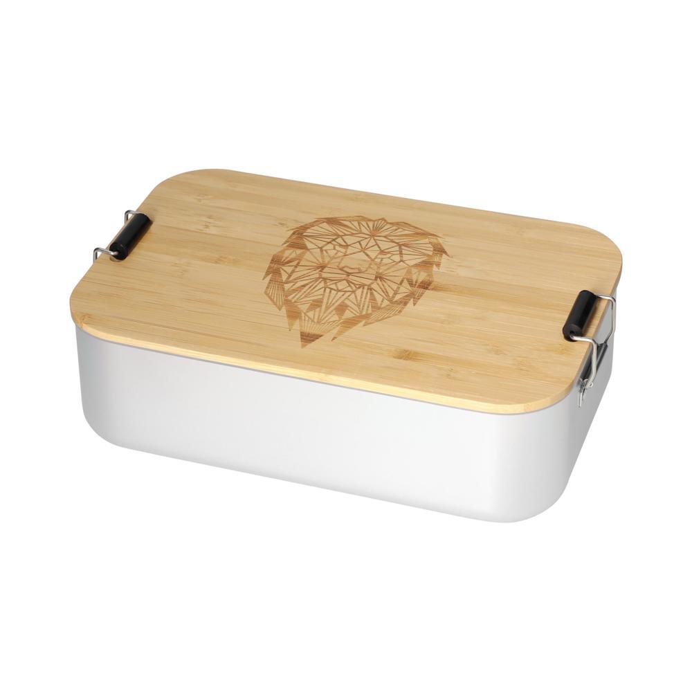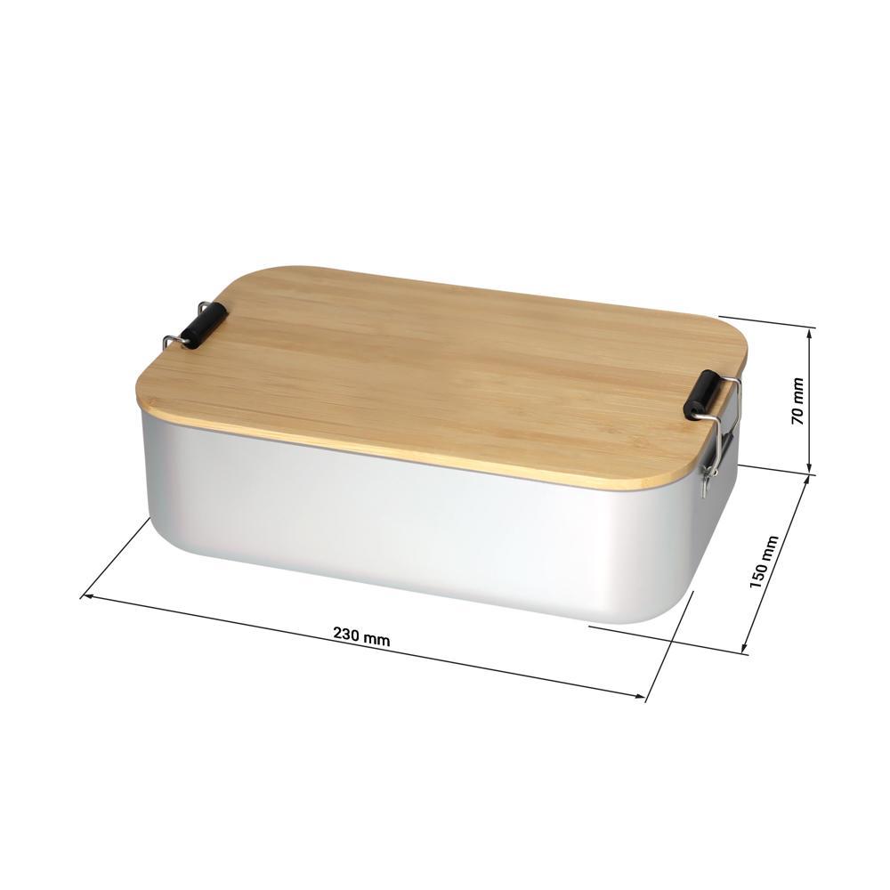 Découvrez cette boîte à déjeuner promotionnelle idéale pour vos actions marketing et événements d'entreprise. Fabriquée en aluminium robuste avec un couvercle en bois de bambou écologique, elle garantit une fermeture sécurisée grâce à un anneau en silicone et une pince pratique.
