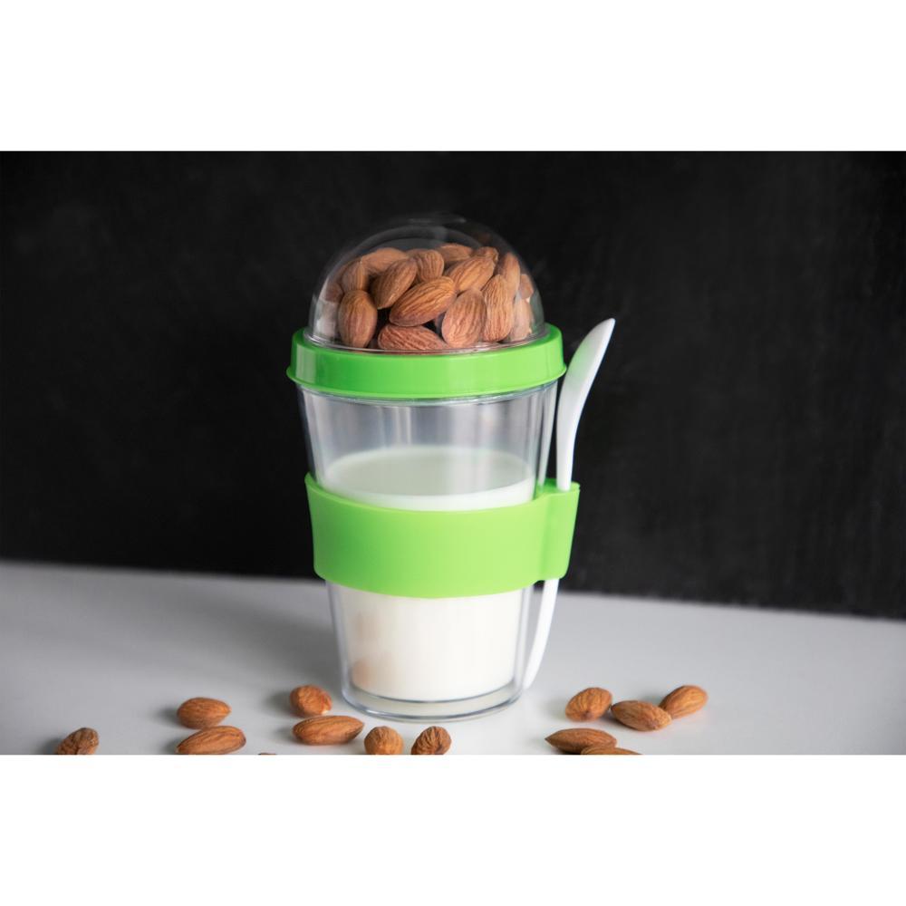Le gobelet à céréales "Spoon" est l'accessoire promotionnel idéal pour vos événements et campagnes marketing. Composé d'un contenant transparent à double paroi en plastique avec un couvercle pratique, il permet de transporter yaourt, lait, céréales ou autres ingrédients séparément, évitant les mélanges intempestifs.
