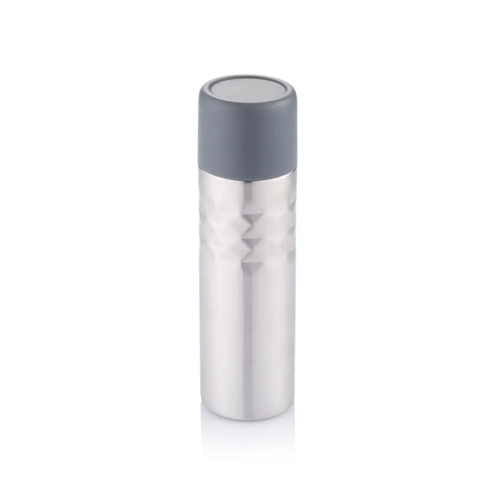 Cette bouteille isotherme d'une capacité de 0,5 litre est équipée d'une double paroi en acier inoxydable 201 et d'un couvercle en PP. Elle respecte les normes de sécurité alimentaire allemande, est conforme à la directive 1907/2006/EC sur les SVHC, sans BPA et sans paraffines chlorées à chaîne courte et moyenne. Diamètre : 69 mm. Emballage individuel dans un polybag et une boîte.