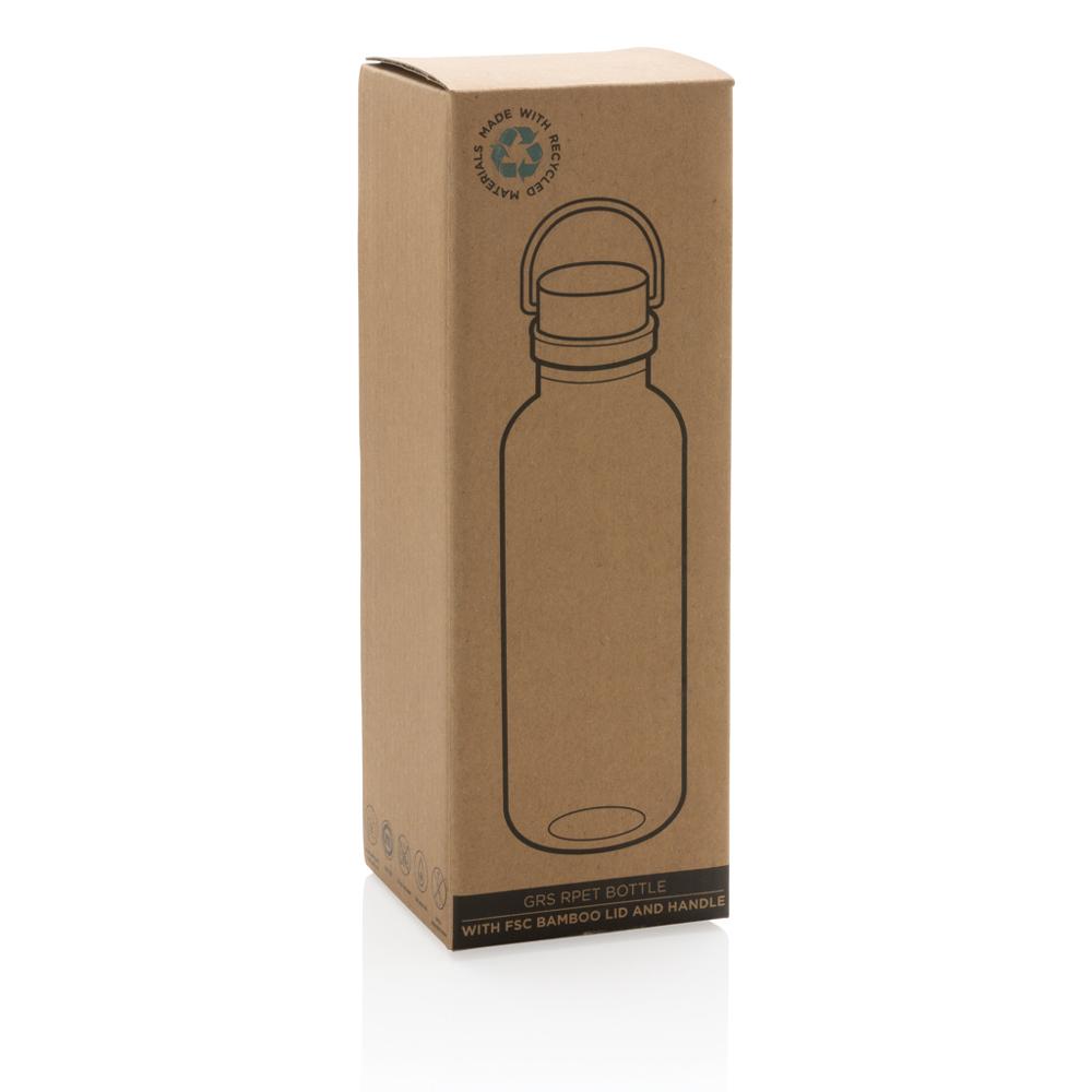 Offrez une bouteille d'eau réutilisable en rPET certifié RCS à paroi simple, idéale pour vos campagnes marketing et événements. Avec son élégant couvercle en bambou certifié FSC® et sa poignée pratique, elle assure un transport facile et un look premium qui valorise votre marque.