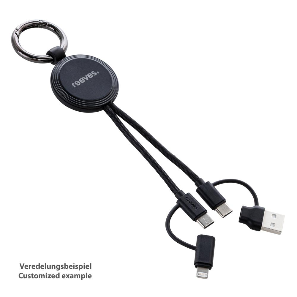 Polyvalent et performant, ce câble multifonction intègre des connexions USB-C, 8-Pin pour Apple et un adaptateur USB-A. Il offre une charge rapide jusqu'à 60 watts et un transfert de données fluide, idéal pour équiper vos clients ou partenaires en cadeaux d'affaires high-tech.
