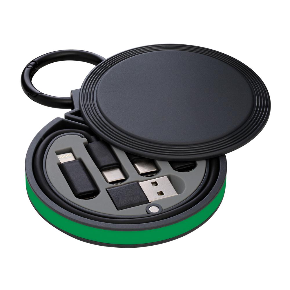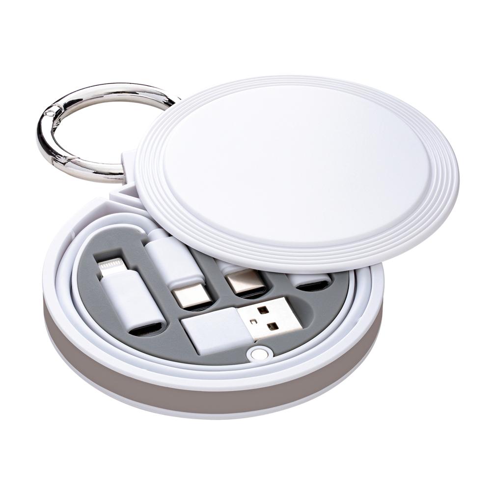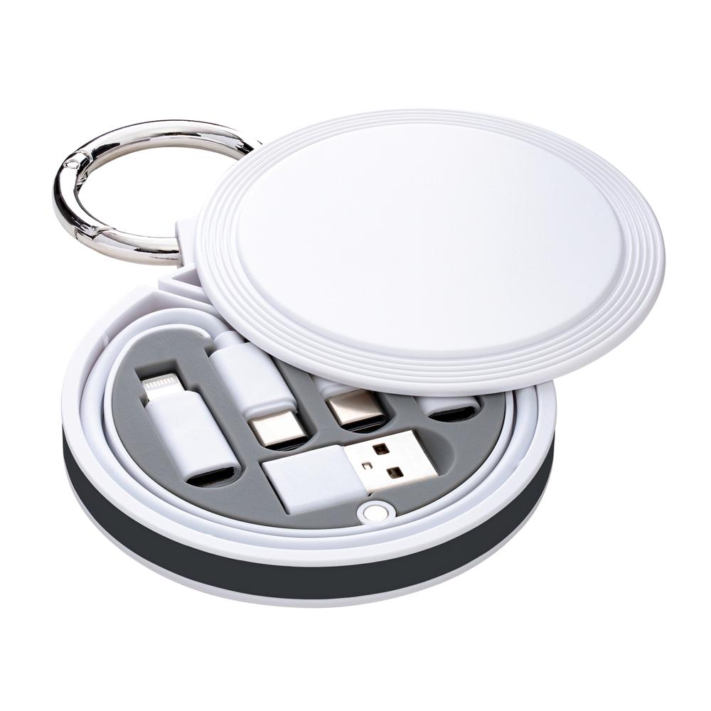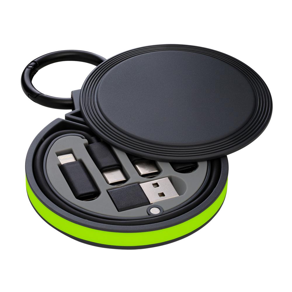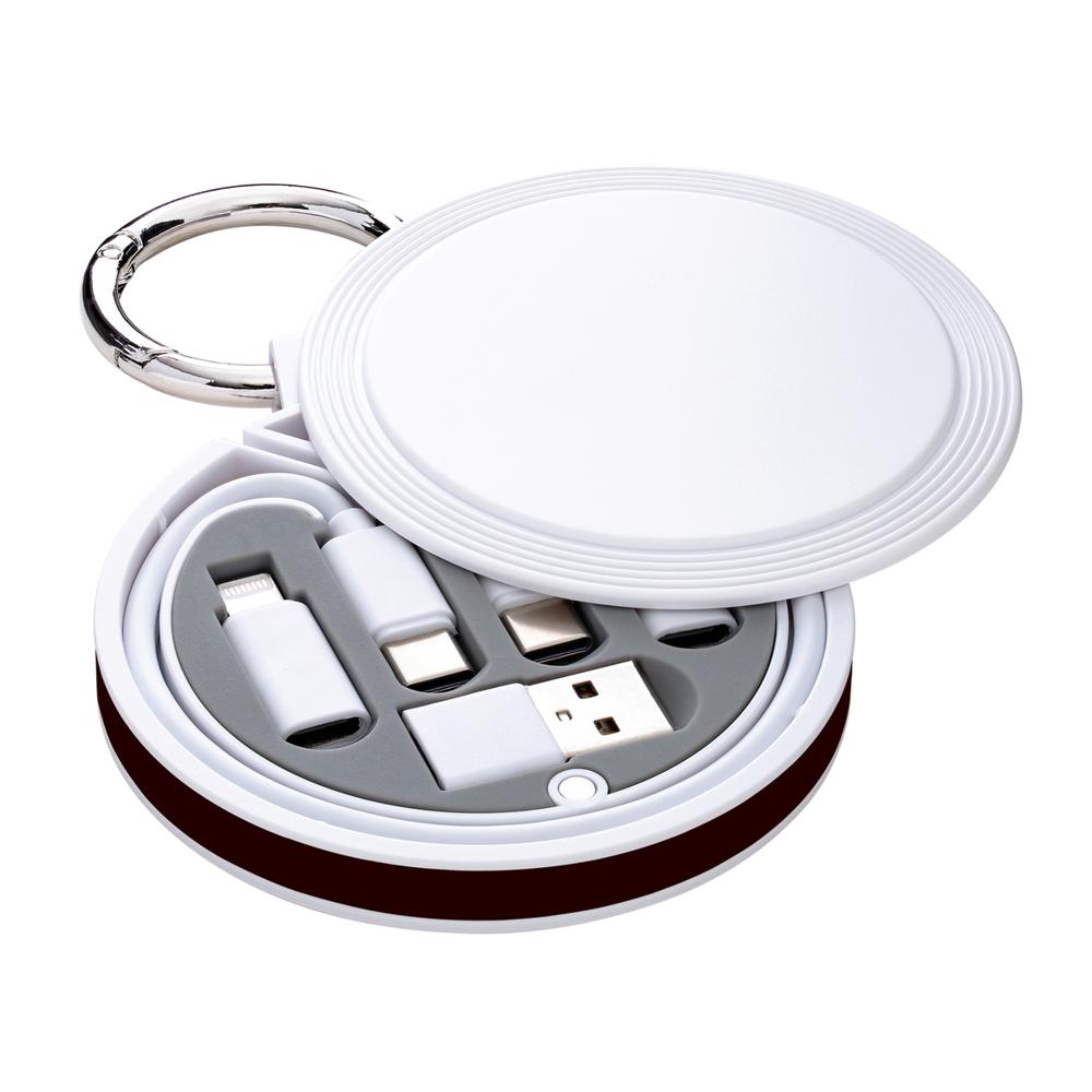Découvrez REEVES-myConvertics, le câble de charge 6 en 1 idéal pour vos campagnes marketing et événements. Ce multitool compact intègre un câble USB-C vers USB-C de 48 cm, des adaptateurs Micro-USB, 8-Pin pour Apple et USB-A, un mousqueton et un anneau fendu de 42 mm pour une fixation facile.