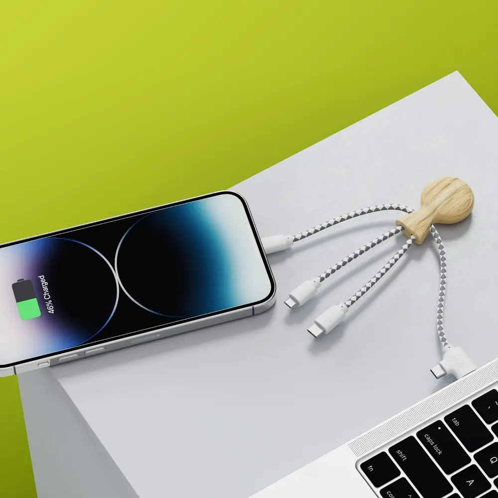 Découvrez le Mr Bio Bamboo, un câble innovant conçu pour charger simultanément plusieurs appareils. Avec ses entrées doubles USB et USB-C, et ses trois connecteurs de sortie, il offre une polyvalence exceptionnelle pour vos besoins quotidiens en mobilité.