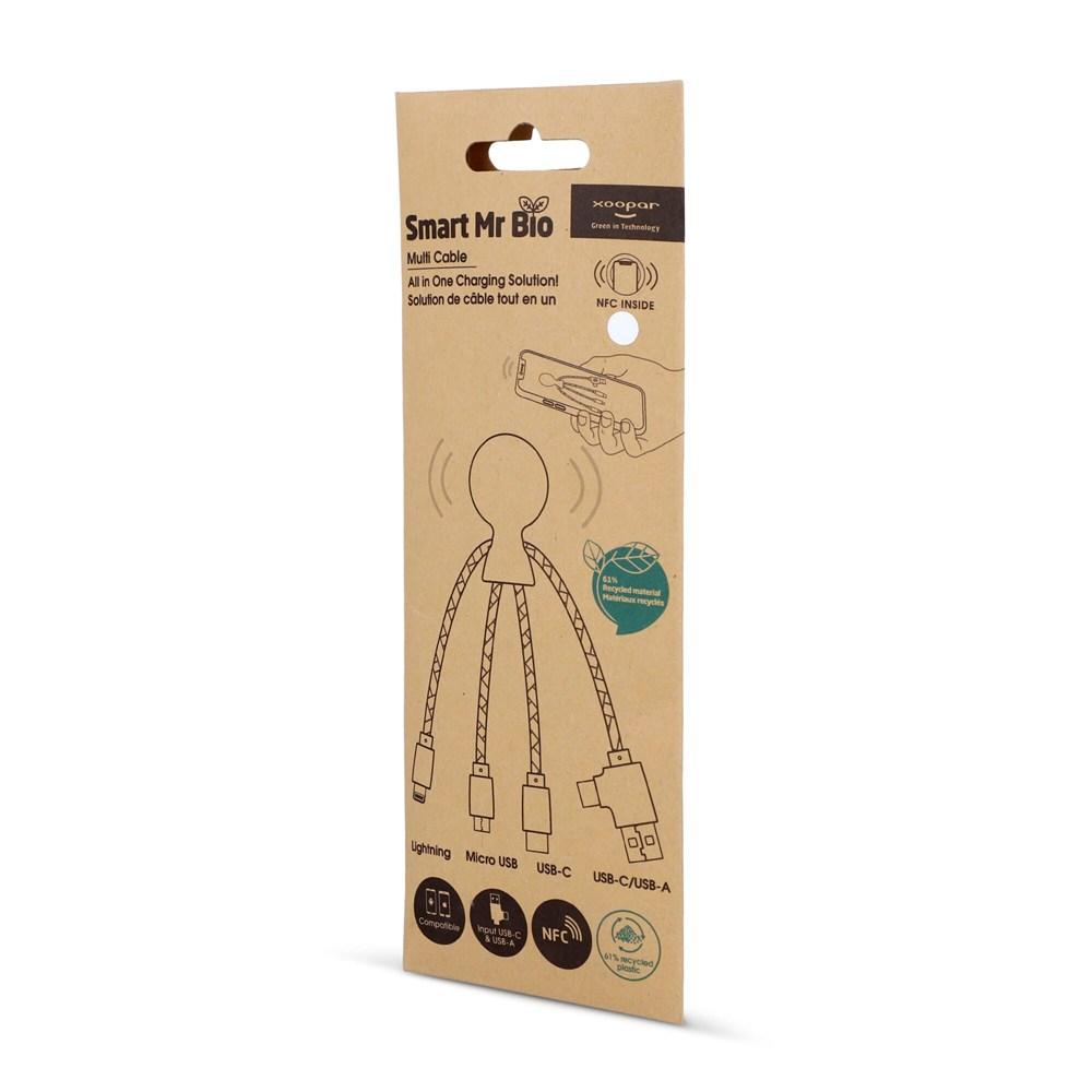 Le câble de recharge éco Mr. Bio intelligent NFC est l'accessoire promotionnel idéal pour vos événements et campagnes marketing. Doté d'un double connecteur d'entrée USB et USB-C, ainsi que de trois sorties adaptées à tous vos appareils, il offre une charge polyvalente et rapide partout.