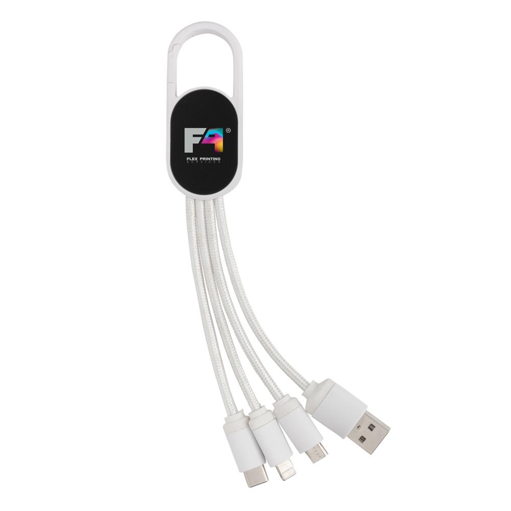 Découvrez notre câble de recharge 4 en 1 avec mousqueton, l'accessoire promotionnel idéal pour vos événements et campagnes marketing. Compact et polyvalent, il intègre une entrée USB et des sorties double-face pour iOS, micro USB et type C, avec des câbles en nylon tressé de 10 cm pour une grande flexibilité.