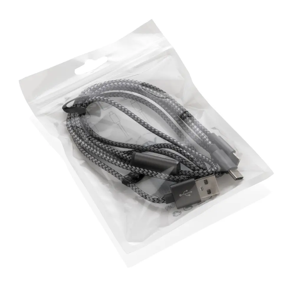 Découvrez notre câble de recharge USB-A vers USB-C et Apple Lightning, un accessoire polyvalent et résistant idéal pour personnaliser avec votre logo. Fabriqué en nylon tressé de 120 cm avec connecteurs en aluminium, il assure une charge rapide et fiable pour appareils iOS et Android. Parfait comme cadeau promotionnel pour événements ou campagnes marketing, il renforce votre marque en offrant praticité et durabilité au quotidien. Compatible avec de nombreux dispositifs, il simplifie la connectivité sans compromettre la qualité. Conforme aux normes européennes strictes pour une sécurité optimale.