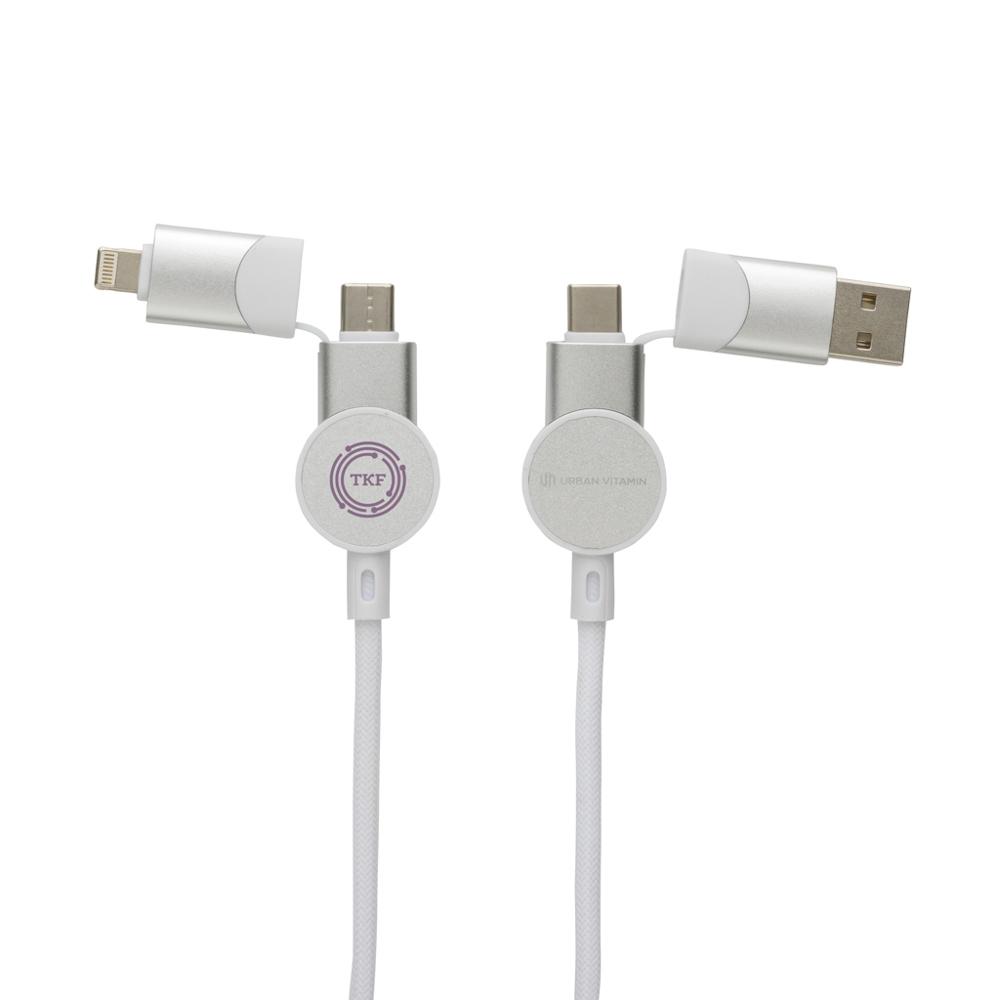 Le câble Oakland 6-en-1 à charge rapide 45W est l'accessoire multifonction idéal pour vos campagnes promotionnelles et événements d'entreprise. Fabriqué en plastique TPE, aluminium recyclé certifié RCS et câble TPE avec couche externe en PET 100 % recyclé, il offre une compatibilité universelle grâce à ses 5 connecteurs : USB-C in, USB-A in, Type-C out, iOS out et micro-USB out. Longueur de 120 cm pour une utilisation pratique au quotidien.