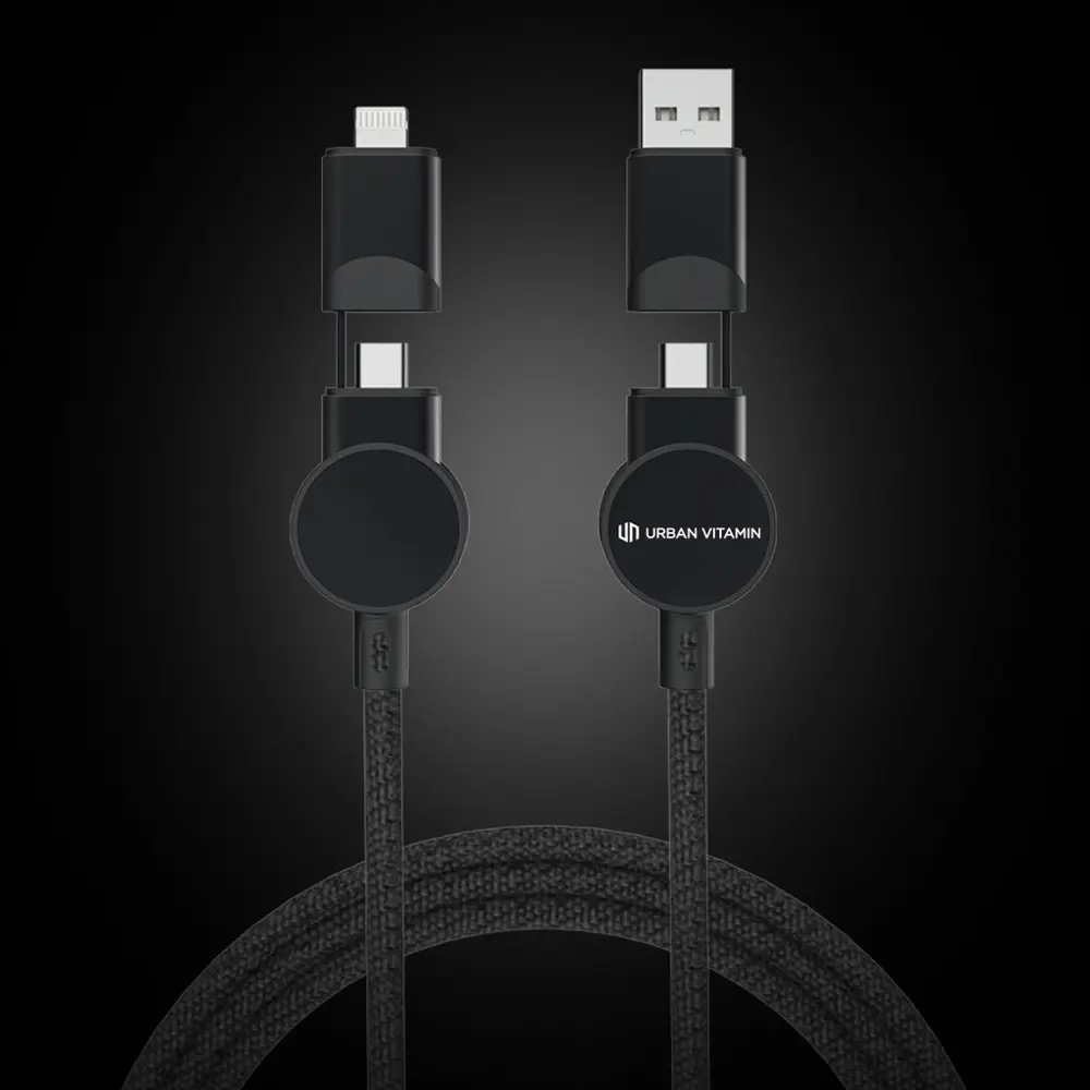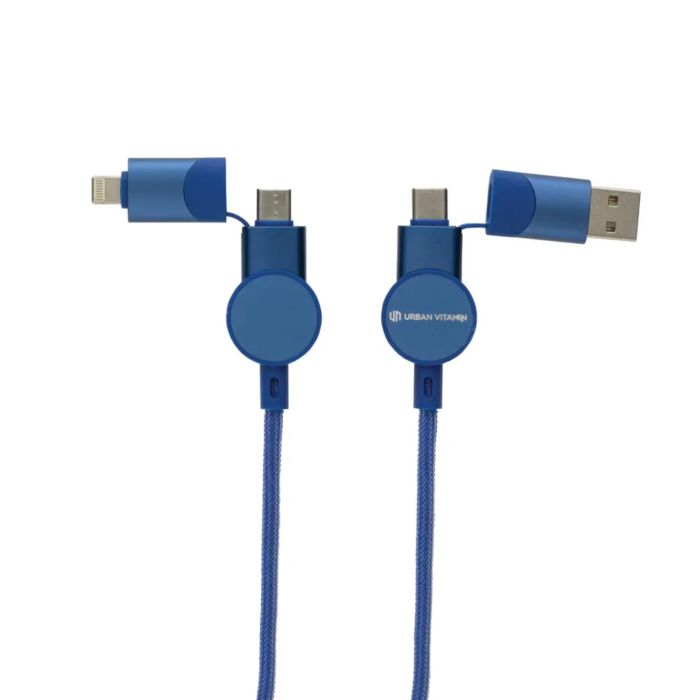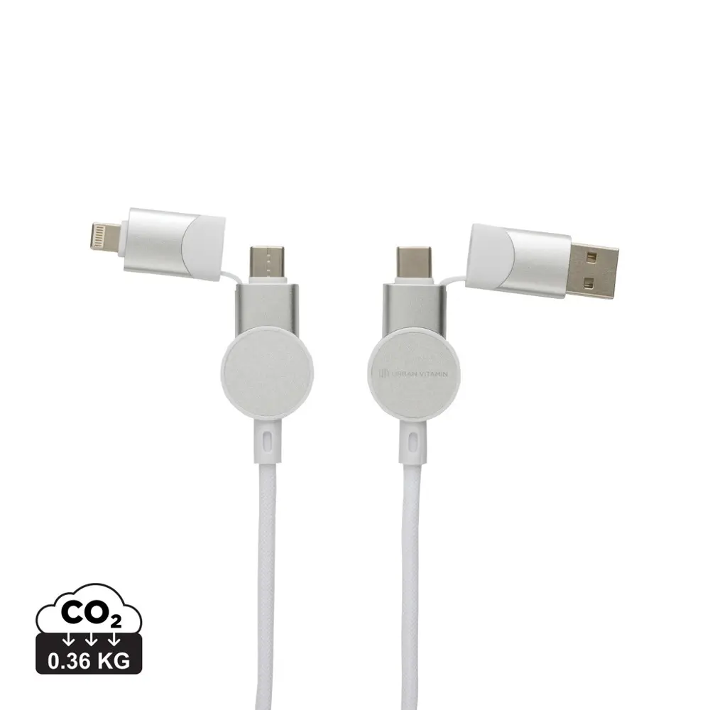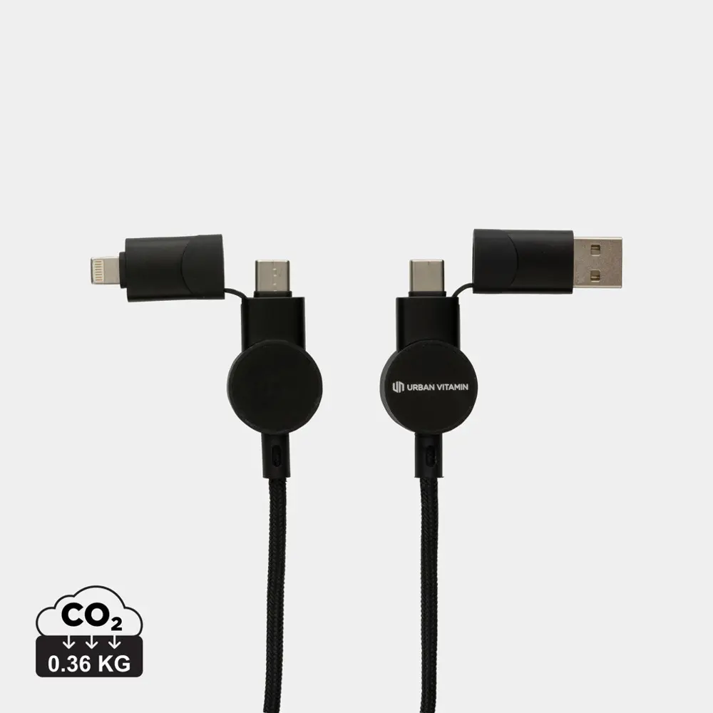 Équipé de 5 connecteurs (USB-C in/out, USB-A in, iOS out, Micro USB out), ce câble de 120 cm s'adapte à tous les appareils modernes, des smartphones aux MacBook, pour une charge et une synchronisation fluide. Parfait pour personnaliser avec votre logo, offrez-le en cadeau promotionnel pour renforcer votre image éco-responsable et fidéliser vos clients lors d'événements ou comme outil publicitaire durable.