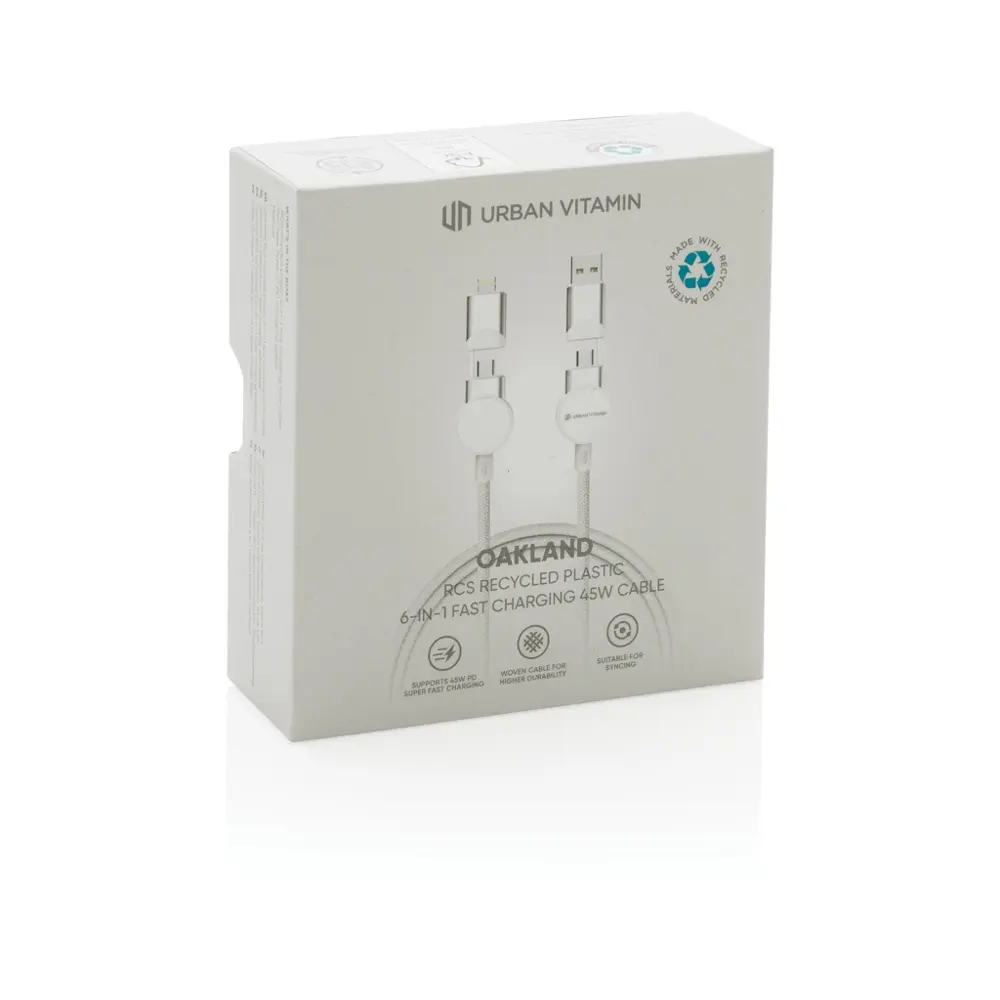 Découvrez le câble Oakland 6-en-1 à charge rapide de 45W, un accessoire multifonctionnel idéal pour vos campagnes marketing et événements d'entreprise. Fabriqué à partir de plastique TPE et d'aluminium recyclé certifié RCS, avec un câble en TPE et une couche externe en PET 100% recyclé, il intègre 52% de contenu recyclé au total. Sans PVC, il respecte les normes environnementales strictes comme REACH et la directive Électromagnétique.