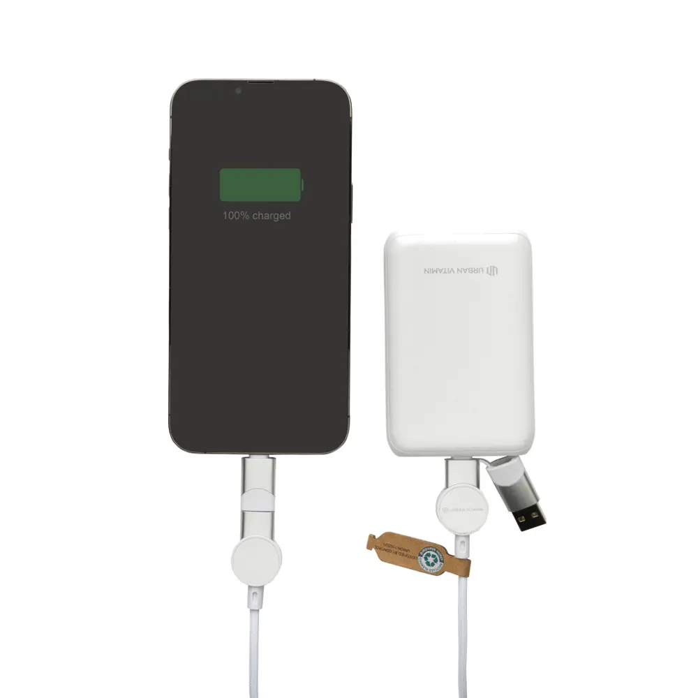 Fabriqué à partir de plastique TPE et d'aluminium recyclé certifié RCS, avec un câble en TPE et une couche externe en PET 100 % recyclé, ce produit atteint 52 % de contenu recyclé sur le poids total. Sans PVC, il respecte les normes environnementales strictes comme la directive Électromagnétique 2014/30/EU, RoHS 2011/65/CE et REACH. Urban Vitamin privilégie des emballages à plastique réduit, aligné sur les valeurs éco-friendly de vos clients corporate.