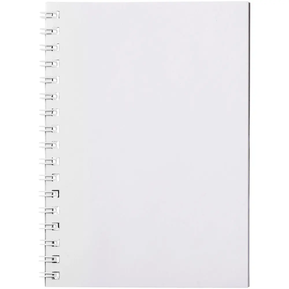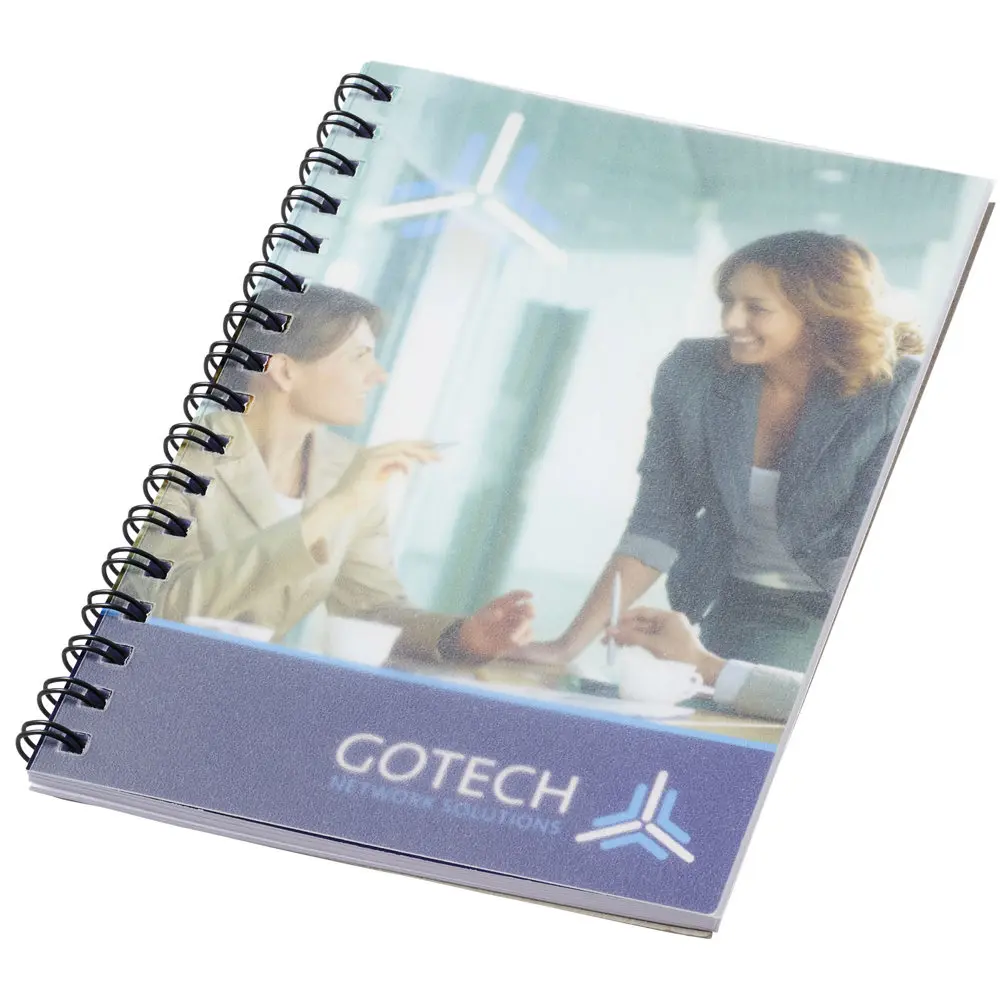Découvrez le cahier Desk-Mate® A6 à spirales avec couverture en polypropylène, un outil promotionnel idéal pour vos campagnes marketing et événements. Ce carnet compact de 14,8 x 10,5 cm offre 50 feuilles de papier vierge 80 g/m², une première de couverture brillante en carton 280 g/m² et une protection transparente en PP pour une durabilité accrue.