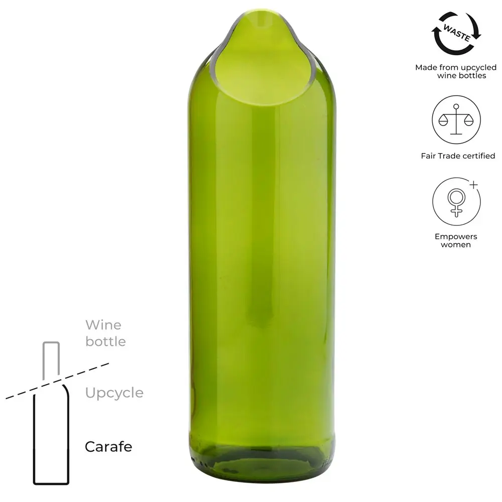 Découvrez la carafe à eau Originalhome, un objet unique fabriqué main à partir de bouteilles de vin recyclées de Zanzibar, en Tanzanie. Récupérées dans des hôtels, restaurants et bars locaux, ces bouteilles sont triées, nettoyées et transformées en formes élégantes pour une touche artisanale et authentique.