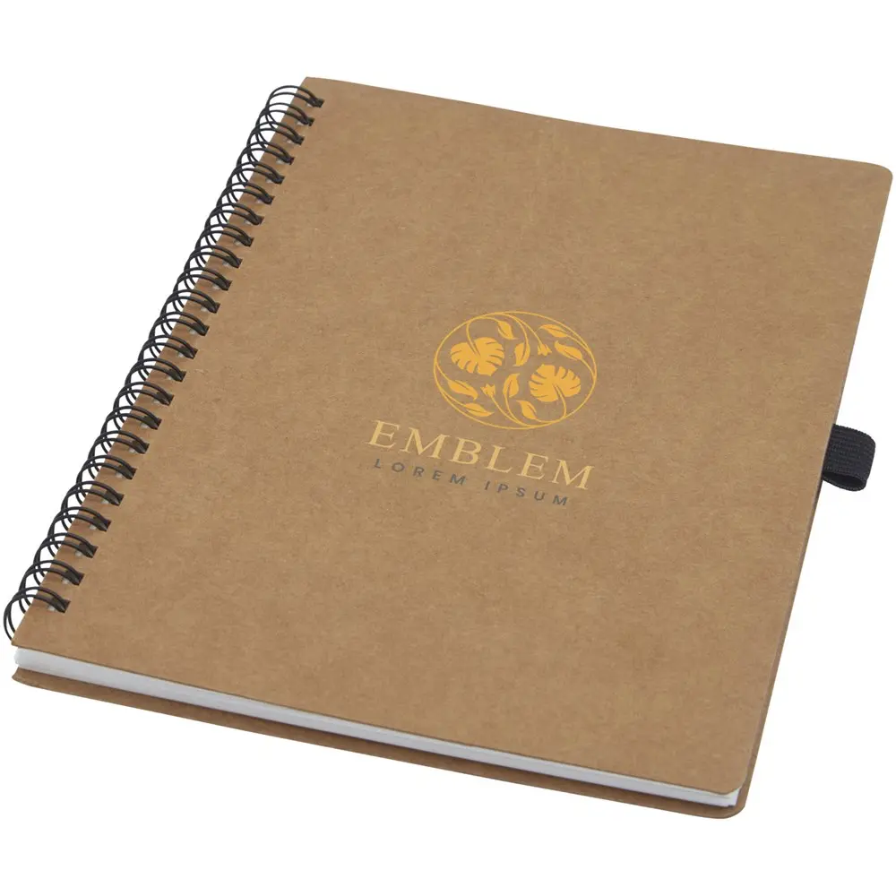 Découvrez ce carnet A5 à spirales, idéal pour les professionnels en quête de supports promotionnels durables. Doté d'une couverture en carton recyclé robuste et d'une boucle pratique pour stylo, il contient 70 feuilles lignées de 60 g/m² fabriquées en papier de pierre. Ce format compact (21,5 x 1 x 14,5 cm) s'adapte parfaitement aux besoins quotidiens lors d'événements ou en cadeau d'entreprise.
