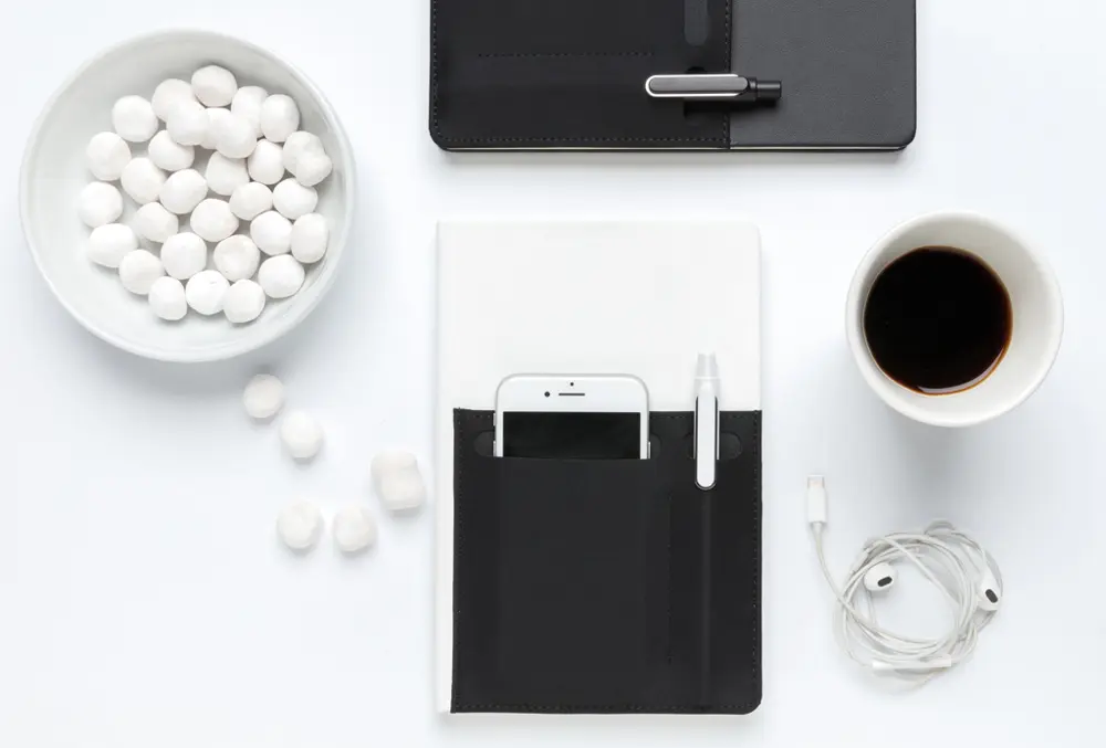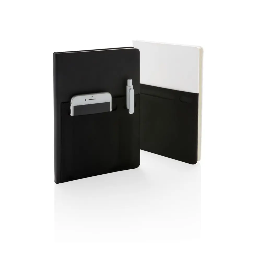 Découvrez notre carnet de notes A5 personnalisable, idéal pour les professionnels du marketing et les organisateurs d'événements. Ce carnet pratique offre une pochette pour téléphone portable (jusqu'à 8 cm de largeur), une pour stylo et une grande pour documents, facilitant l'organisation quotidienne de vos clients ou partenaires.