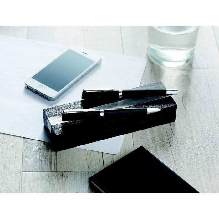 Découvrez cette parure de stylos raffinée, composée d'un stylo bille twist et d'un stylo roller, fabriqués en laiton et acier inoxydable. Présentée dans un coffret cadeau premium, cette set d'écriture est l'allié idéal pour vos stratégies de communication d'entreprise.