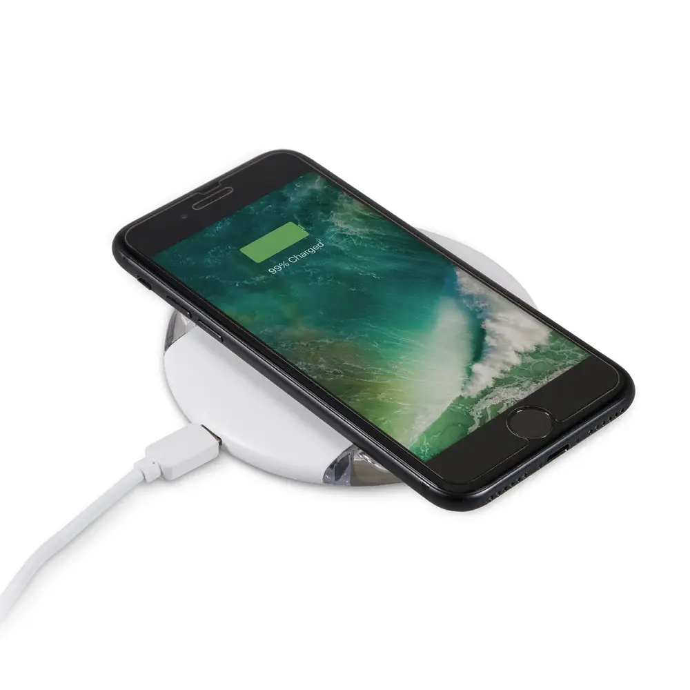 Découvrez ce chargeur sans fil 5W au design contemporain, idéal pour moderniser vos cadeaux d'entreprise. Il se connecte directement à votre appareil, permettant une recharge fluide et sans câble de votre téléphone. La zone transparente s'illumine lors du chargement, offrant un indicateur visuel clair et attractif.