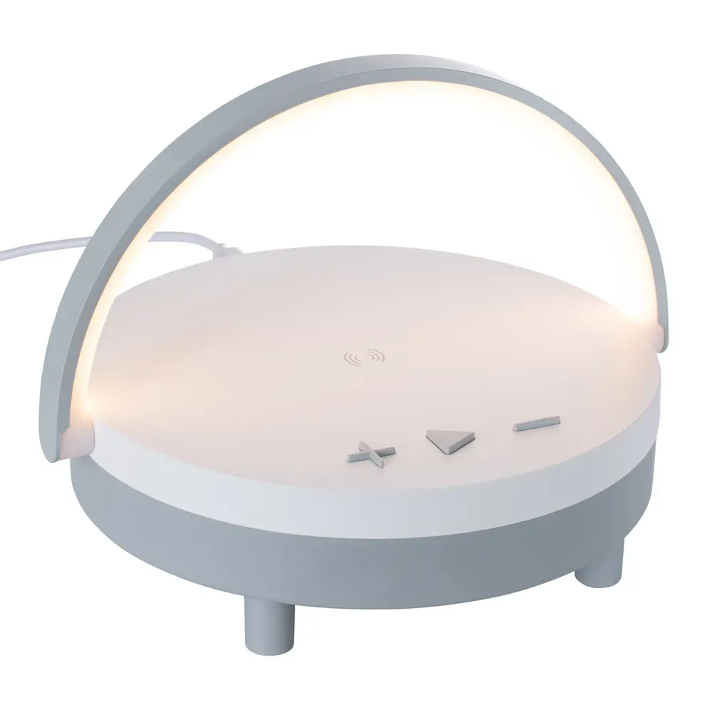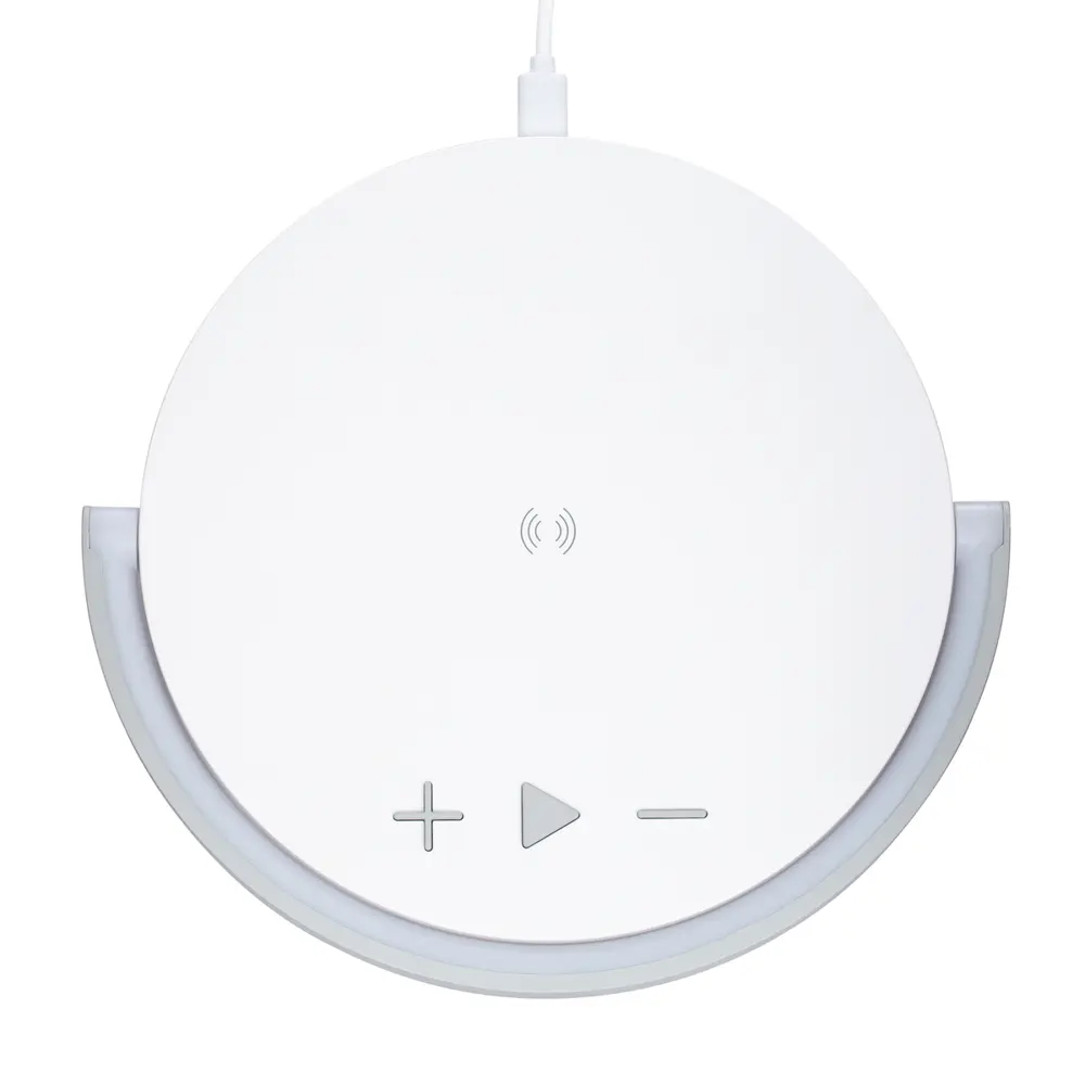 Découvrez ce chargeur à induction combiné à une enceinte et un éclairage d'ambiance, idéal pour les professionnels en quête de cadeaux d'entreprise personnalisés. Cet appareil en plastique offre une solution polyvalente pour recharger vos appareils tout en diffusant de la musique ou en créant une atmosphère cosy.