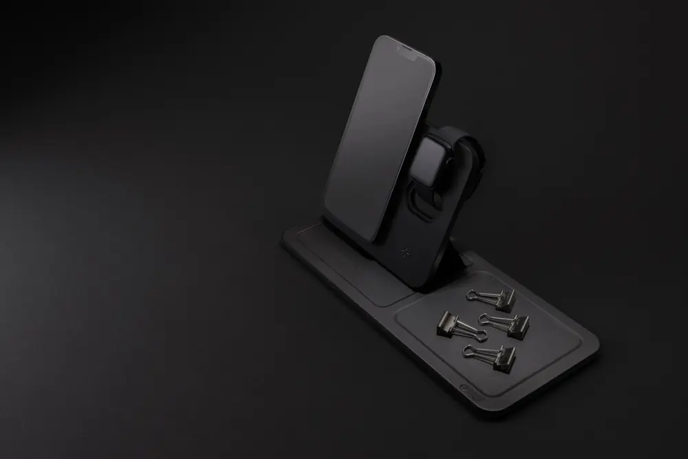 Découvrez notre chargeur sans fil 3-en-1, conçu pour recharger simultanément votre smartphone, vos écouteurs et votre montre connectée. Idéal pour les professionnels en déplacement, ce modèle pliable s'adapte parfaitement à un usage quotidien au bureau ou lors d'événements.