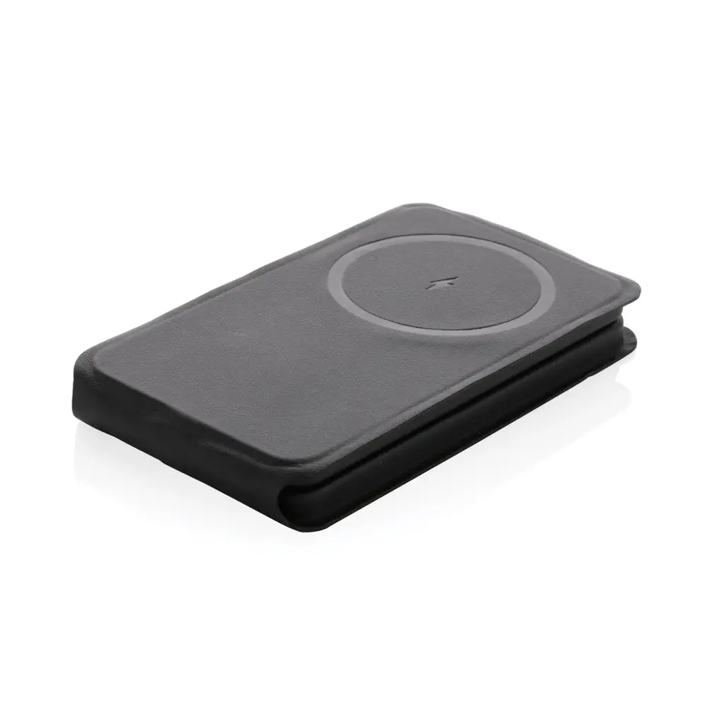 Ce chargeur pliable en PU recyclé certifié RCS intègre 5 % de contenu recyclé, garantissant une chaîne d'approvisionnement durable. Sa certification RCS assure la traçabilité des matériaux, renforçant l'image éco-responsable de votre marque. Compact et luxueux, il se transporte facilement, parfait pour des cadeaux d'affaires qui impressionnent. La recharge magnétique 15 W à l'avant accélère le chargement des smartphones, tandis que le dos propose une option 5 W pour les écouteurs et 2,5 W pour les smartwatches compatibles (comme les montres Apple). Inclut un câble TPE recyclé de 120 cm, le tout emballé dans du kraft FSC® mix, 100 % sans PVC. Profitez d'une entrée optimisée 9V/3A pour une performance fiable, favorisant la satisfaction client et la fidélisation.