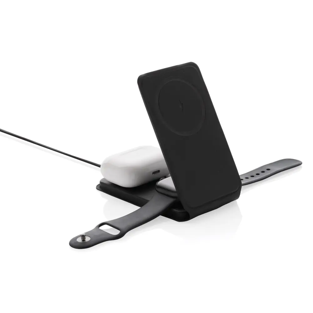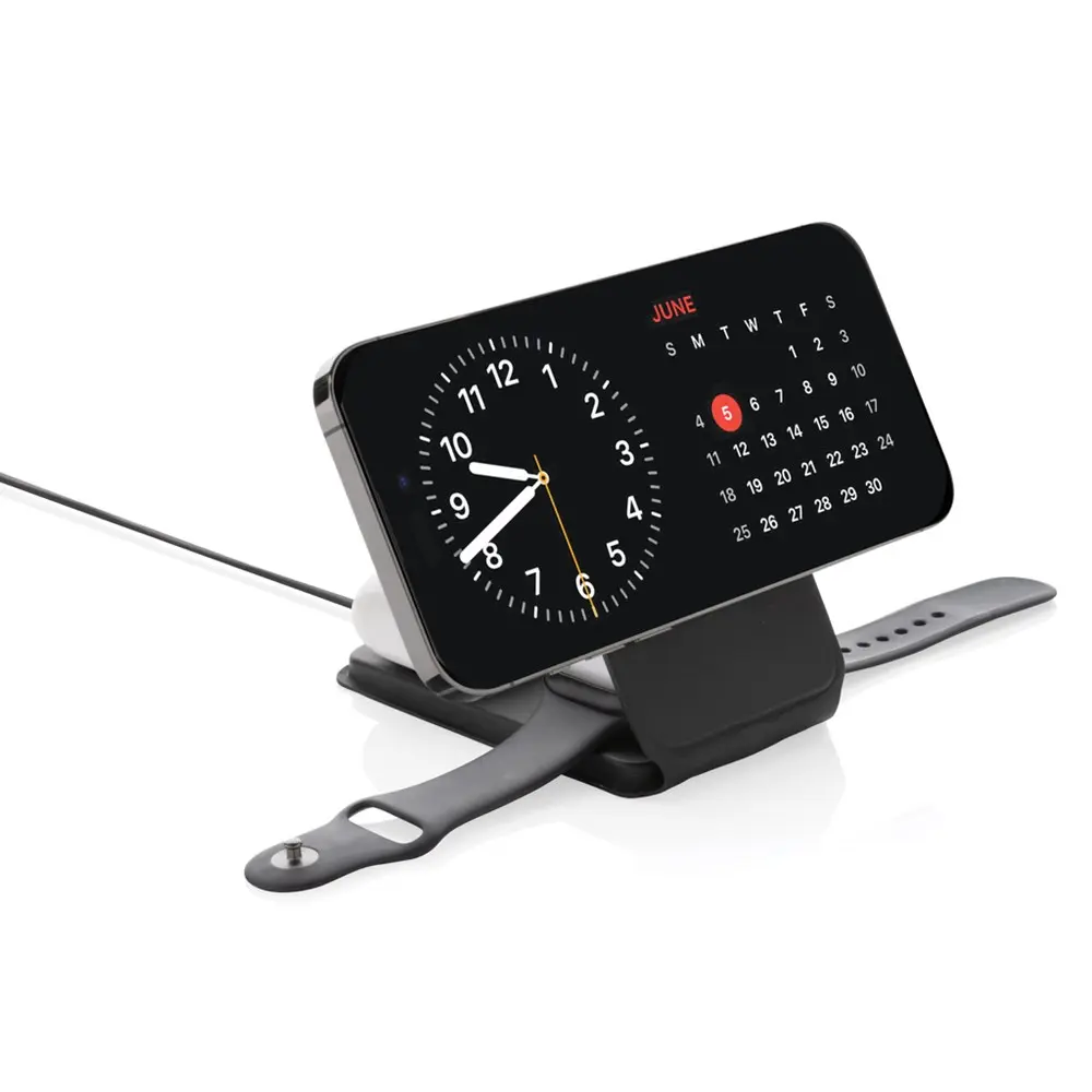Découvrez ce chargeur sans fil 3 en 1, conçu pour une recharge pratique et écologique. Idéal pour les professionnels du marketing et les organisateurs d'événements, il offre une solution élégante pour personnaliser avec votre logo et distribuer à vos clients ou partenaires lors de salons ou campagnes promotionnelles.