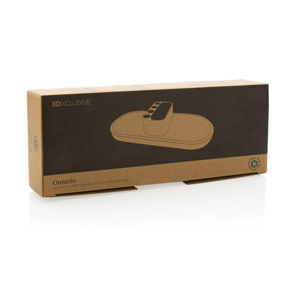 Chargeur à induction 10W double Ontario avec porte-stylo, idéal pour les entreprises et événements. Fabriqué en ABS recyclé certifié RCS (31 % de matières recyclées) et base en bambou FSC® 100 %, il allie durabilité et élégance écologique. Compatible avec les dernières générations Android et iPhone 8+, il charge simultanément deux appareils sans fil pour une productivité optimale.