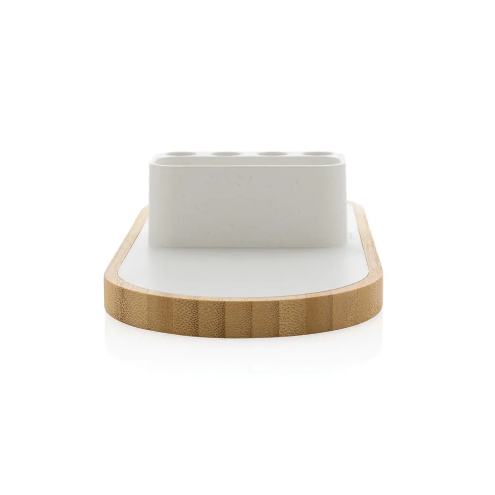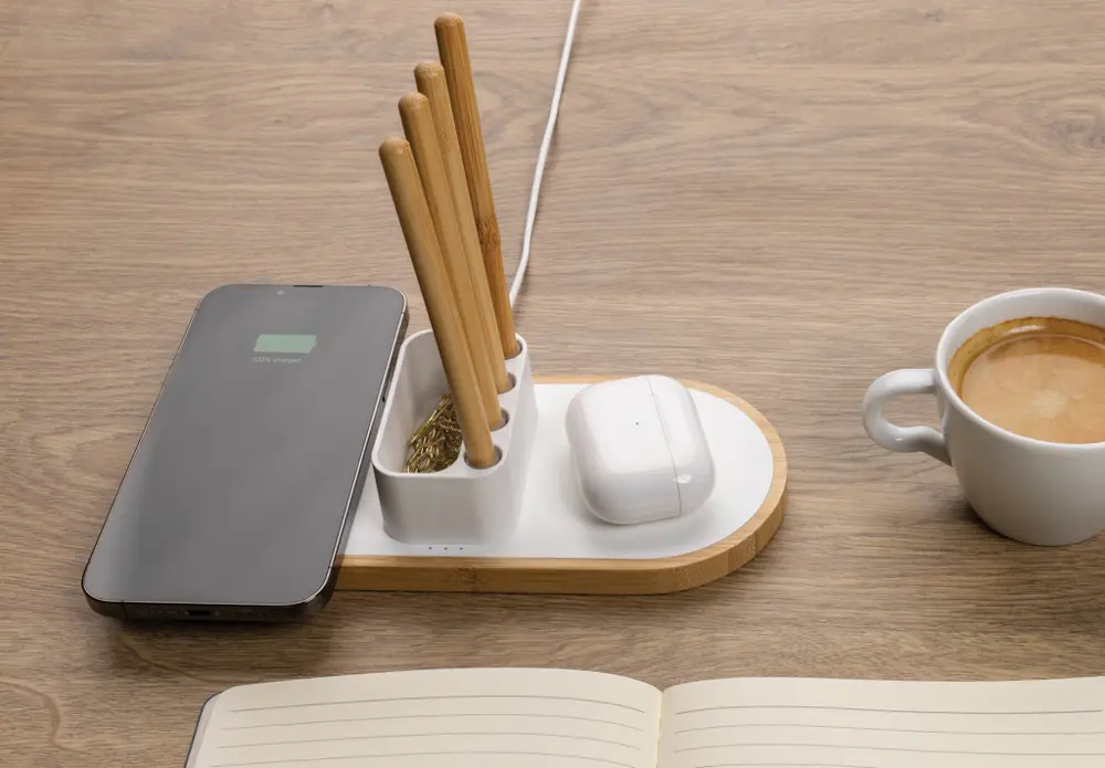 Offrez un cadeau promotionnel qui allie écologie et praticité. Ce chargeur permet de recharger simultanément deux appareils sans fil, compatible avec les dernières générations Android et iPhone 8 ou supérieurs. Son porte-stylo intégré dispose de quatre espaces pour ranger crayons, cartes de visite ou petits objets, transformant un simple accessoire en outil de bureau indispensable. Sans PVC et avec un câble Type-C de 120 cm en TPE recyclé RCS, il garantit une expérience sans fil fluide et respectueuse de l'environnement. Personnalisez-le avec votre logo pour booster la visibilité de votre marque lors d'événements ou comme cadeau client durable.