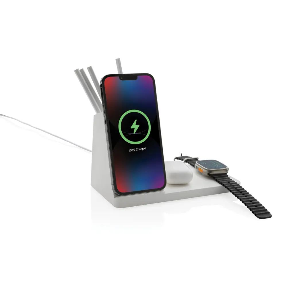 Le chargeur intègre une base en ABS recyclé certifié, une zone de recharge en bambou FSC, et un porte-stylo pratique. Il inclut un câble Type-C de 120 cm en TPE recyclé RCS, et est emballé dans une boîte kraft FSC mix. Sorties : 9V/3A pour 15W, 5V/1A pour 5W, 5V/0,5A pour 2,5W, et USB/Type-C à 5V/2,1A. Modèle déposé pour une exclusivité ajoutée.