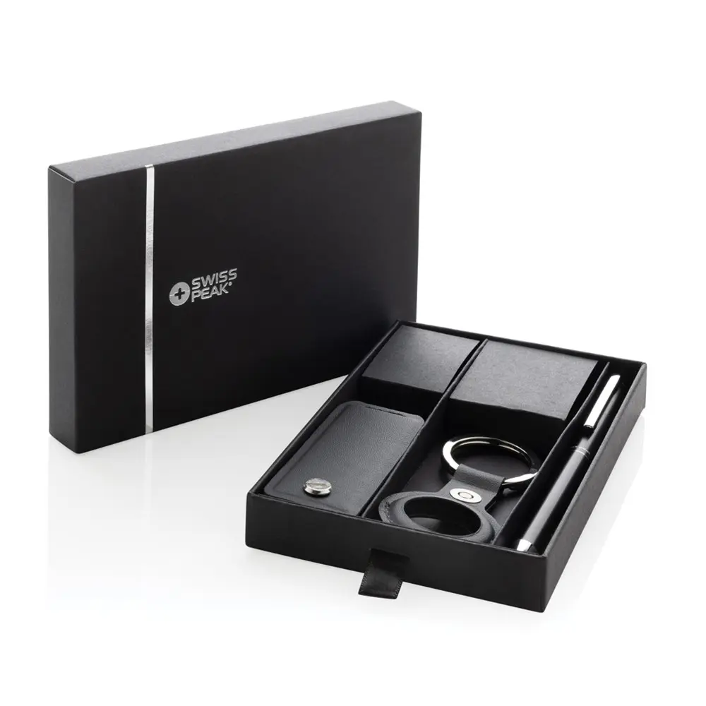 Découvrez notre coffret cadeau 3 pièces Swiss Peak Tula, idéal pour les entreprises cherchant des relationnel geschenken personnalisés et durables. Ce set inclut un organisateur de clés pratique pour jusqu'à 4 clés, un support AirTag pour localiser facilement vos objets précieux, et un stylo en aluminium recyclé pour des notes rapides et élégantes.
