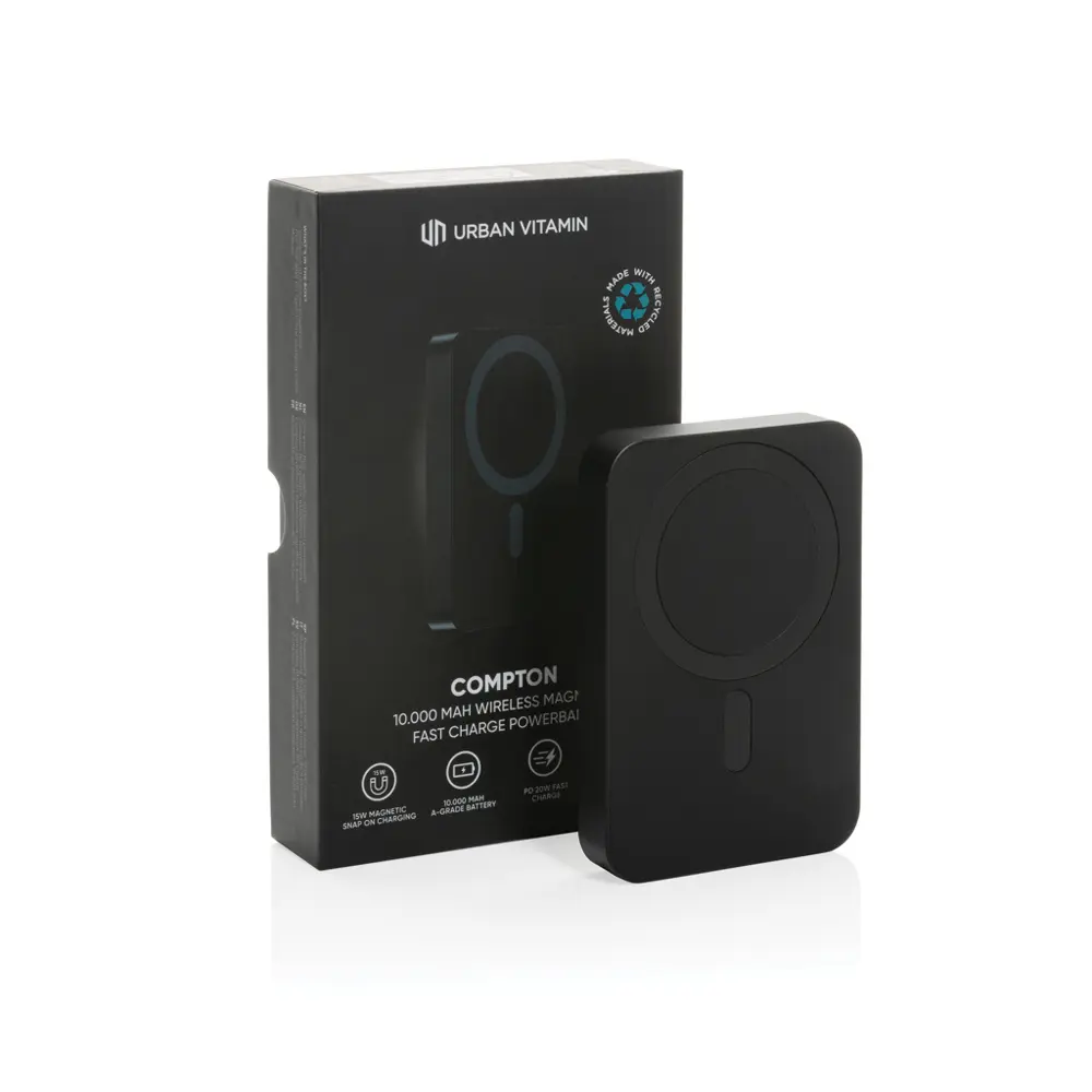 La powerbank Compton de 10 000 mAh avec technologie magnétique offre une fixation facile sur iPhone 12 et modèles ultérieurs, ainsi que sur les Android récents, pour une charge sans fil ultra-rapide de 15 W. Idéale pour les professionnels du marketing et organisateurs d'événements, elle se personnalise avec votre logo, devenant un cadeau promotionnel impactant à distribuer en masse lors d'événements ou pour fidéliser vos clients.