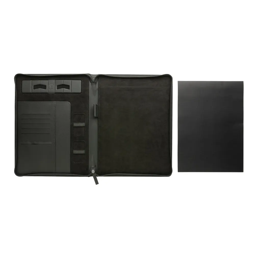 Doté d'une housse zippée en PU recyclé certifié RCS, il offre un support pour tablette ou téléphone, des emplacements pour cartes de visite, des rangements pour notes et papiers, ainsi qu'un passant pour stylo. À l'intérieur, un bloc de 20 feuilles A4 lignées en papier minéral de 144 g/m² assure une écriture fluide et durable.