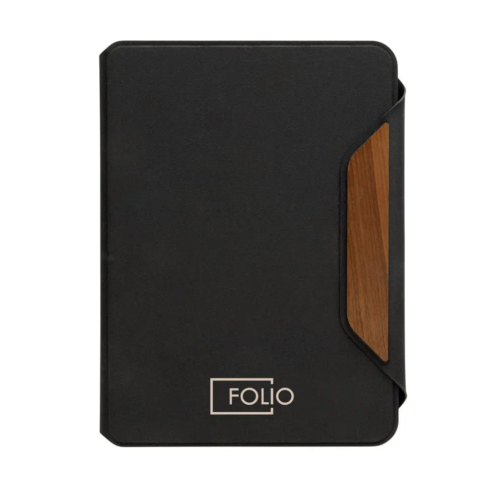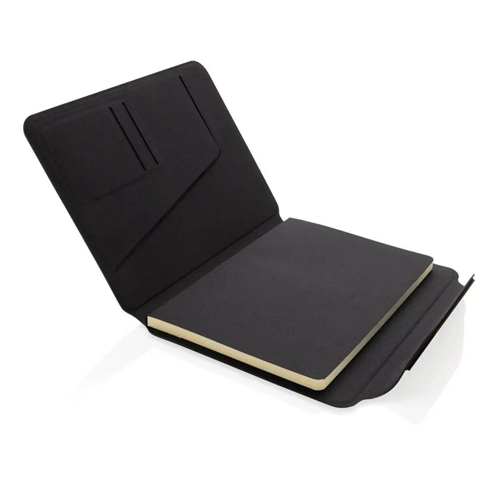 Sa fermeture magnétique sécurise vos documents, tandis que l'intérieur offre deux emplacements pour cartes de visite et une pochette dédiée aux formats A5. Le carnet inclus, doté de 128 pages lignées sur papier FSC® recyclé, favorise une organisation optimale. Emballé dans une boîte cadeau FSC®, ce conférencier éco-responsable (sans PVC) soutient des initiatives comme Water.org via 2 % des ventes AWARE™. Parfait pour des commandes en volume, il valorise vos relations commerciales avec style et respect de l'environnement.
