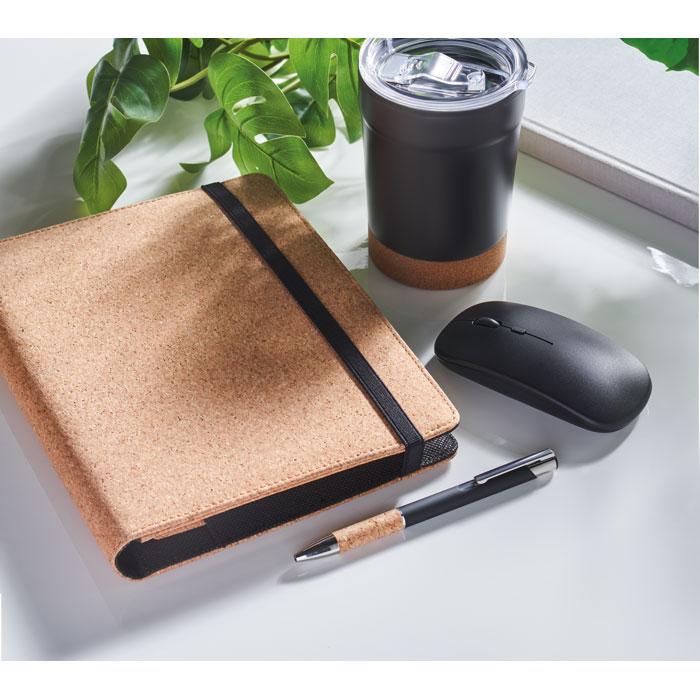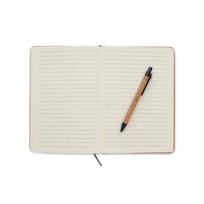 ORIGIN - Conférencier A5 en liège : un carnet de notes A5 amovible avec une couverture rigide en liège naturel, idéal pour une personnalisation avec votre logo. Composé de 192 pages lignées en papier recyclé (96 feuilles), il inclut un stylo et un porte-stylo assortis, deux porte-cartes et un grand compartiment pour vos documents essentiels. La fermeture élastique assure une protection optimale.