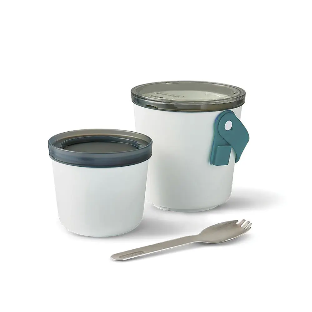 Composé de deux pots verrouillables, il inclut une sangle en silicone pratique pour transporter une spork en acier inoxydable. Séparez yaourts, fruits, nouilles ou soupes en toute simplicité. Une fois le repas terminé, le petit pot s'insère dans le grand pour un rangement optimal. Résistant et durable, il convient parfaitement aux usages quotidiens intensifs en contexte professionnel.
