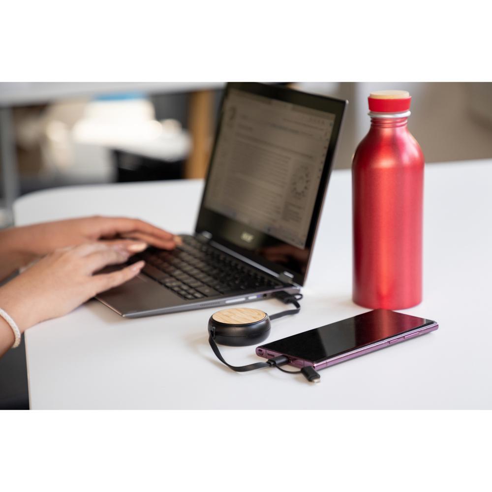 Compatible avec une large gamme d'appareils grâce à ses entrées USB-A et USB-C, et sorties USB-C, micro-USB et Lightning, il assure une recharge rapide jusqu'à 21,8 watts. Son design en bambou naturel allie élégance et durabilité, renforçant l'image écologique de votre marque.