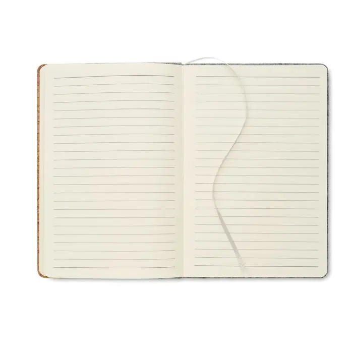 Ce carnet A5 arbore une couverture en feutre RPET recyclé combiné à du liège naturel, offrant une texture résistante et un aspect premium. À l'intérieur, 160 pages lignées en papier recyclé (80 feuilles) assurent un espace généreux pour les notes. Il inclut un passant pour stylo pratique, une fermeture par élastique sécurisée et un marque-page assorti pour une utilisation quotidienne fluide. Certifié FSC MIX 100% (P7.1 | FSC-C213206), il respecte les normes environnementales strictes.